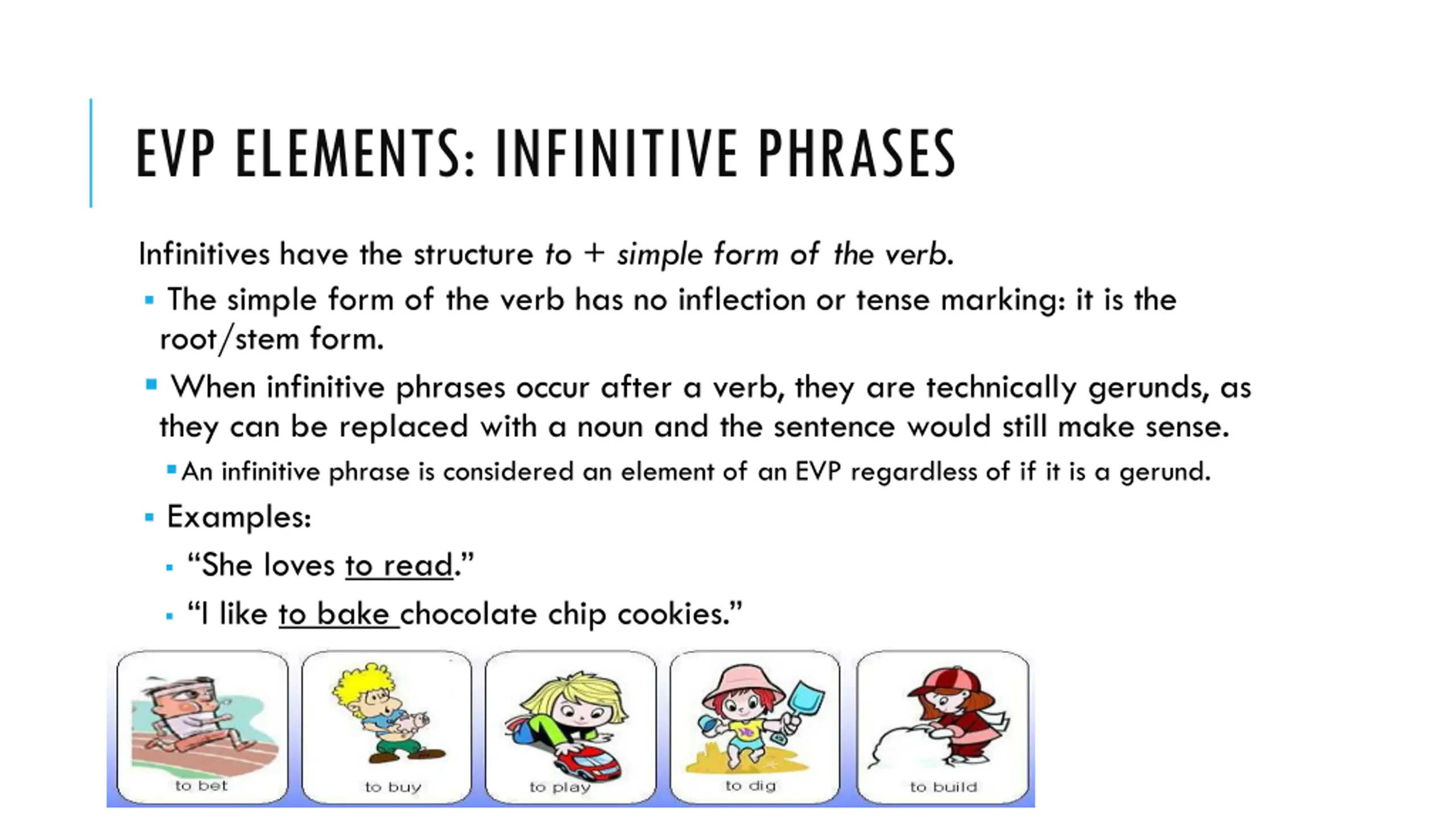 EVP ELEMENTS: INFINITIVE PHRASES Infinitives have the structure to + simple form of the verb. The simple form of the verb has no inflection or tense marking: it is the root/stem form. When infinitive phrases occur after a verb, they are technically gerunds, as they can be replaced with a noun and the sentence would still make sense. An infinitive phrase is considered an element of an EVP regardless of if it is a gerund. Examples: She loves to read. I like to bake chocolate chip cookies.