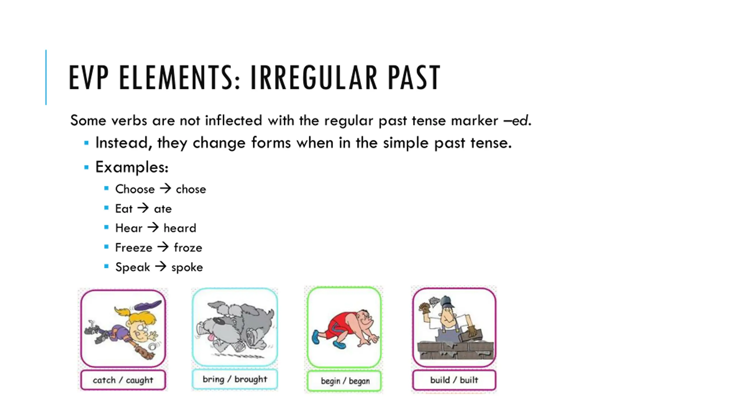 EVP ELEMENTS: IRREGULAR PAST Some verbs are not inflected with the regular past tense marker ed. Instead, they change forms when in the simple past tense. Examples: Choose chose Eat ate Hear heard Freeze froze Speak spoke
