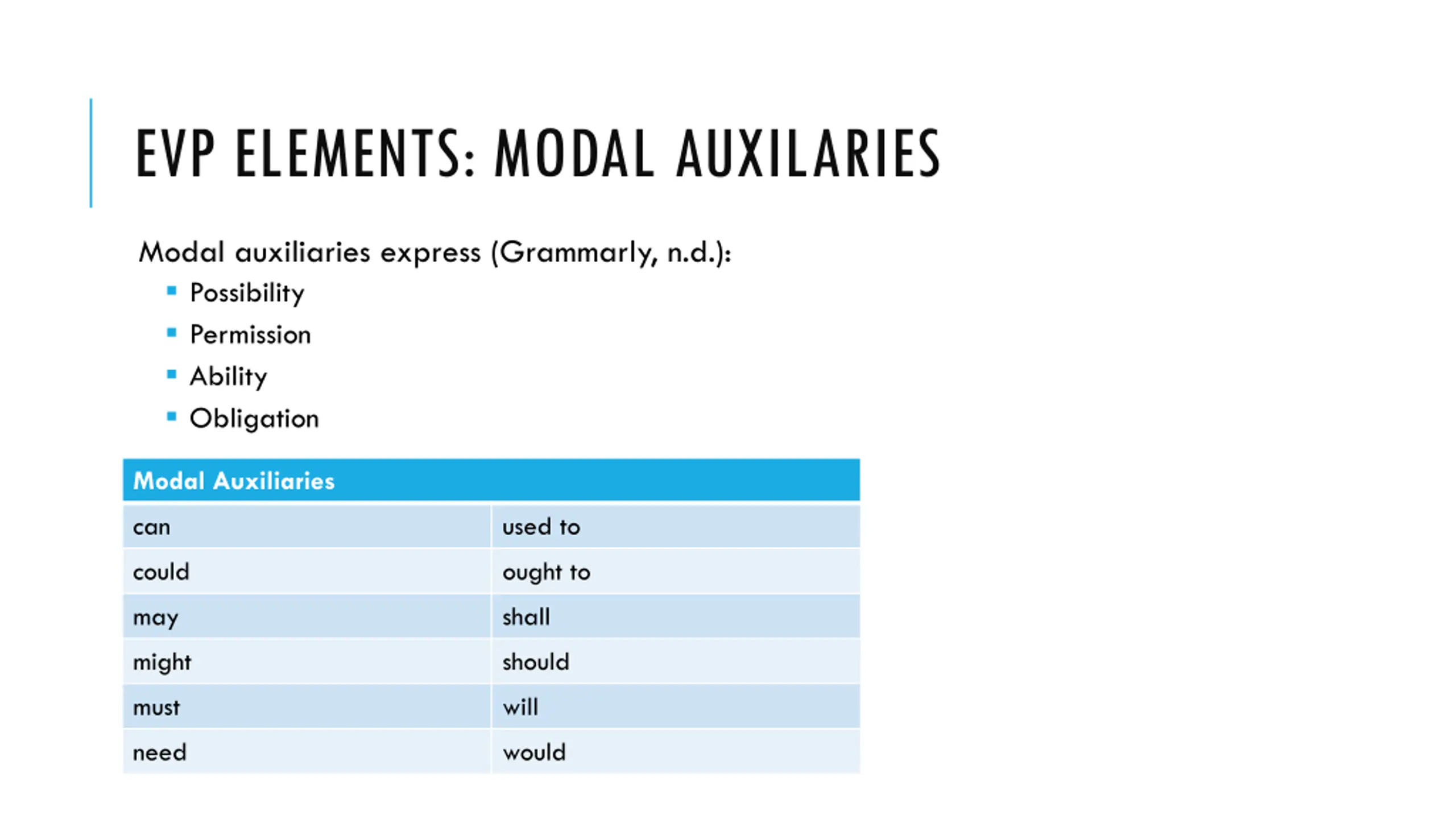 EVP ELEMENTS: MODAL AUXILARIES Modal auxiliaries express (Grammarly, n.d.): Possibility Permission Ability Obligation Modal Auxiliaries can used to could ought to may shall might should must will need would