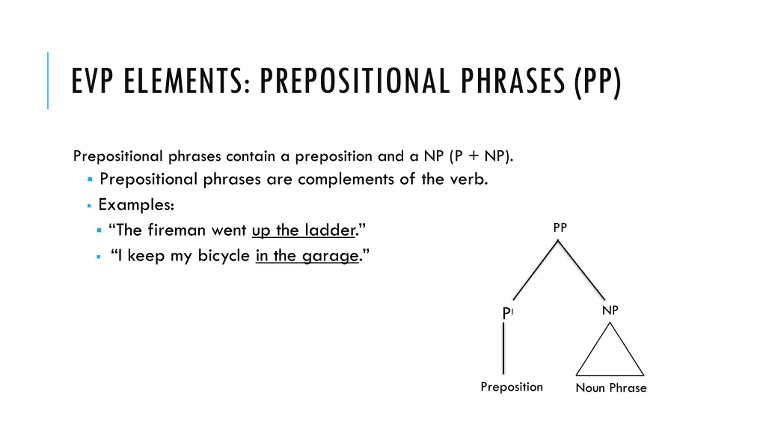 EVP ELEMENTS: PREPOSITIONAL PHRASES (PP) Prepositional phrases contain a preposition and a NP (P + NP). Prepositional phrases are complements of the verb. Examples: The fireman went up the ladder. I keep my bicycle in the garage. PP NP PI Preposition Noun Phrase
