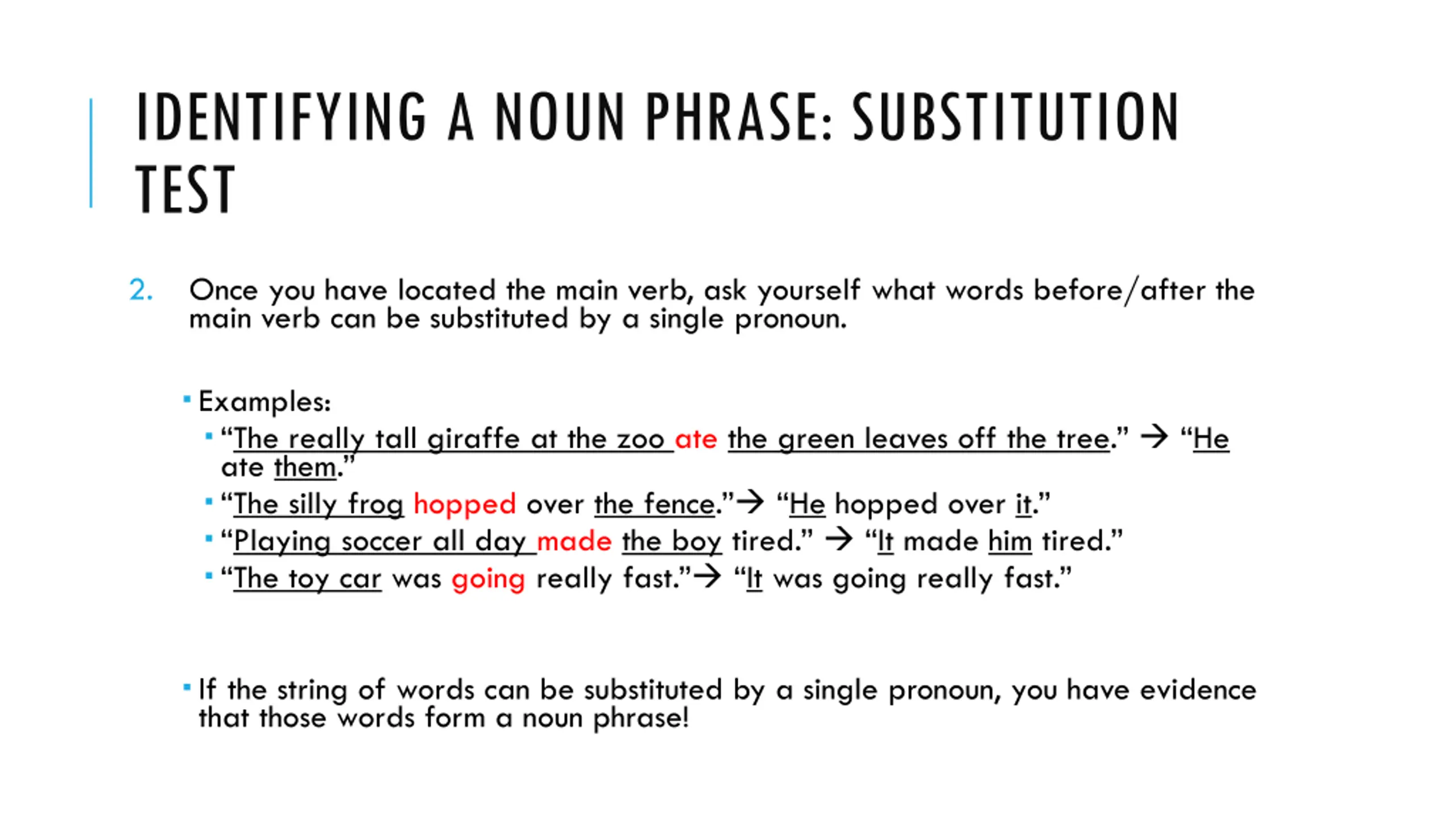 IDENTIFYING A NOUN PHRASE: SUBSTITUTION TEST 2. Once you have located the main verb, ask yourself what words before/after the main verb can be substituted by a single pronoun. Examples: The really tall giraffe at the zoo ate the green leaves off the tree. He ate them. The silly frog hopped over the fence. He hopped over it. Playing soccer all day made the boy tired. It made him tired. The toy car was going really fast. It was going really fast. If the string of words can be substituted by a single pronoun, you have evidence that those words form a noun phrase!
