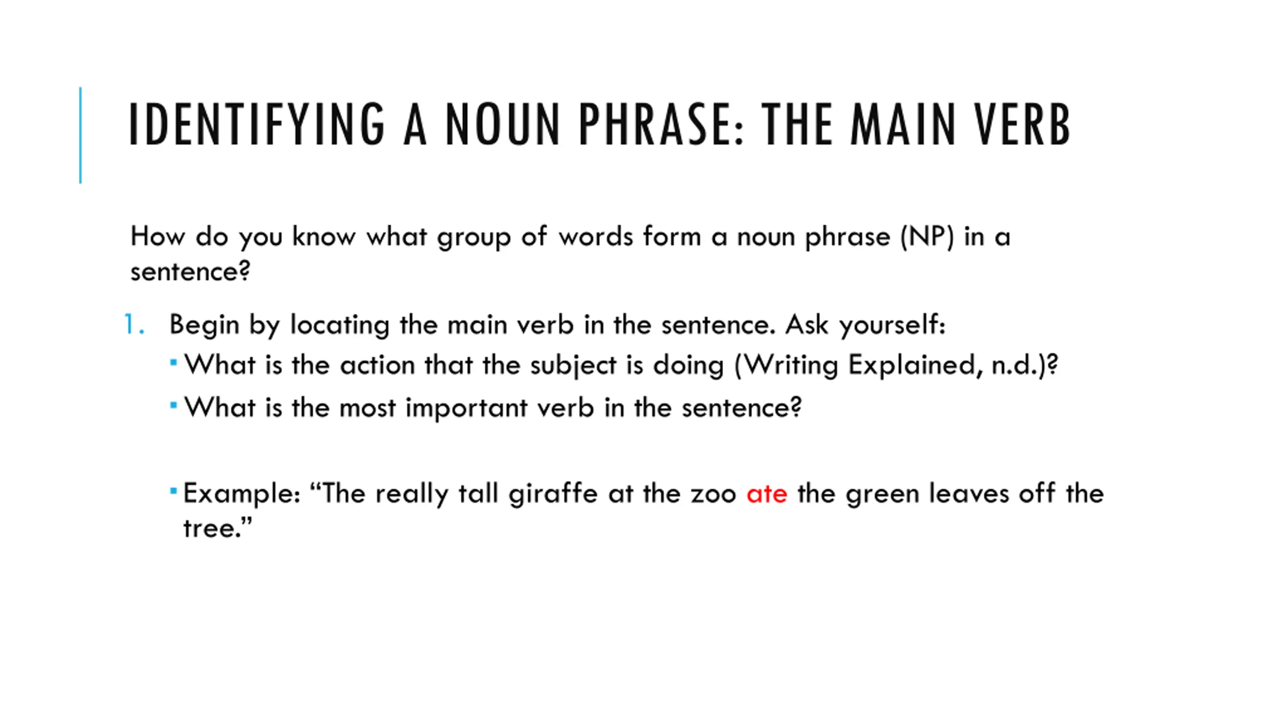 IDENTIFYING A NOUN PHRASE: THE MAIN VERB How do you know what group of words form a noun phrase (NP) in a sentence? 1. Begin by locating the main verb in the sentence. Ask yourself: What is the action that the subject is doing (Writing Explained, n.d.)? What is the most important verb in the sentence? Example: The really tall giraffe at the zoo ate the green leaves off the tree.