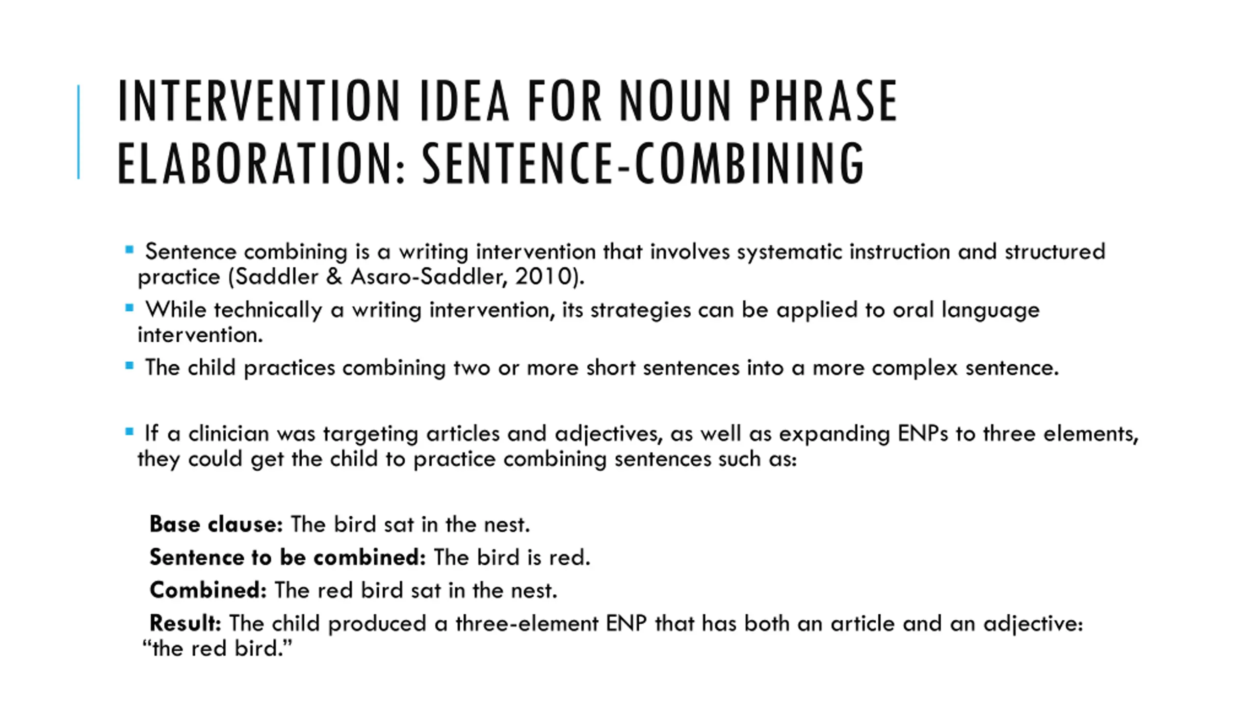 INTERVENTION IDEA FOR NOUN PHRASE ELABORATION: SENTENCE-COMBINING Sentence combining is a writing intervention that involves systematic instruction and structured practice (Saddler & Asaro-Saddler, 2010). While technically a writing intervention, its strategies can be applied to oral language intervention. The child practices combining two or more short sentences into a more complex sentence. If a clinician was targeting articles and adjectives, as well as expanding ENPs to three elements, they could get the child to practice combining sentences such as: Base clause: The bird sat in the nest. Sentence to be combined: The bird is red. Combined: The red bird sat in the nest. Result: The child produced a three-element ENP that has both an article and an adjective: the red bird.