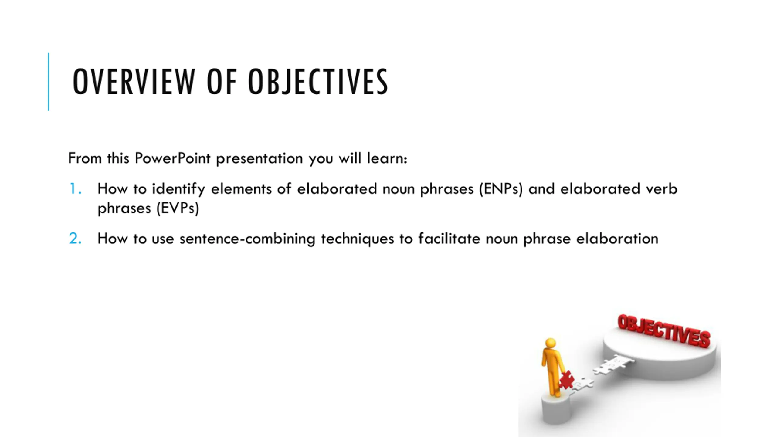 OVERVIEW OF OBJECTIVES From this PowerPoint presentation you will learn: 1. How to identify elements of elaborated noun phrases (ENPs) and elaborated verb phrases (EVPs) 2. How to use sentence-combining techniques to facilitate noun phrase elaboration
