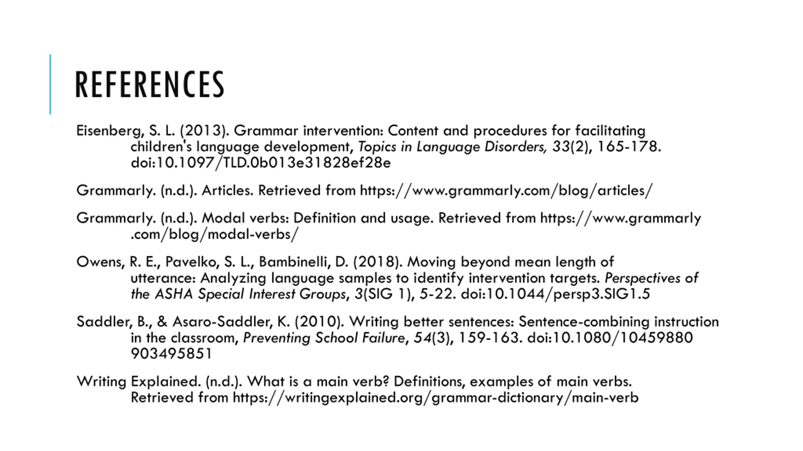 REFERENCES Eisenberg, S. L. (2013). Grammar intervention: Content and procedures for facilitating children's language development, Topics in Language Disorders, 33(2), 165-178. doi:10.1097/TLD.0b013e31828ef28e Grammarly. (n.d.). Articles. Retrieved from https://www.grammarly.com/blog/articles/ Grammarly. (n.d.). Modal verbs: Definition and usage. Retrieved from https://www.grammarly .com/blog/modal-verbs/ Owens, R. E., Pavelko, S. L., Bambinelli, D. (2018). Moving beyond mean length of utterance: Analyzing language samples to identify intervention targets. Perspectives of the ASHA Special Interest Groups, 3(SIG 1), 5-22. doi:10.1044/persp3.SIG1.5 Saddler, B., & Asaro-Saddler, K. (2010). Writing better sentences: Sentence-combining instruction in the classroom, Preventing School Failure, 54(3), 159-163. doi:10.1080/10459880 903495851 Writing Explained. (n.d.). What is a main verb? Definitions, examples of main verbs. Retrieved from https://writingexplained.org/grammar-dictionary/main-verb