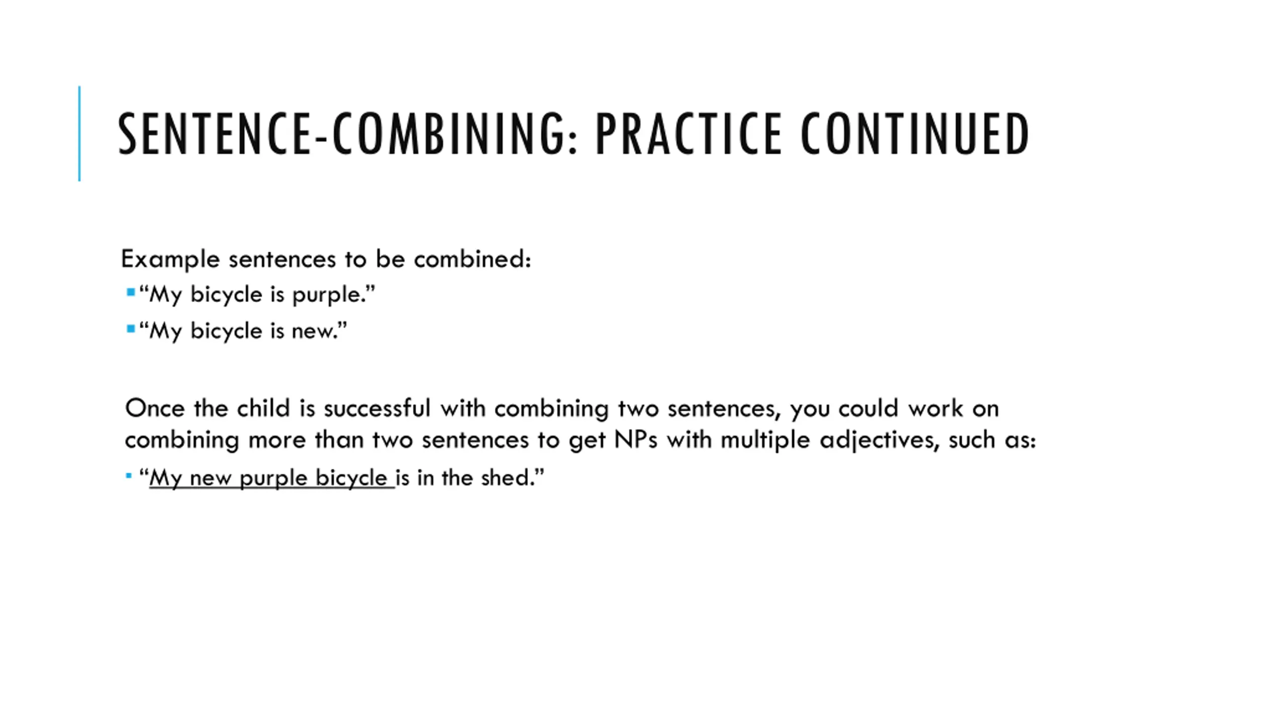 SENTENCE-COMBINING: PRACTICE CONTINUED Example sentences to be combined: My bicycle is purple. My bicycle is new. Once the child is successful with combining two sentences, you could work on combining more than two sentences to get NPs with multiple adjectives, such as: My new purple bicycle is in the shed.