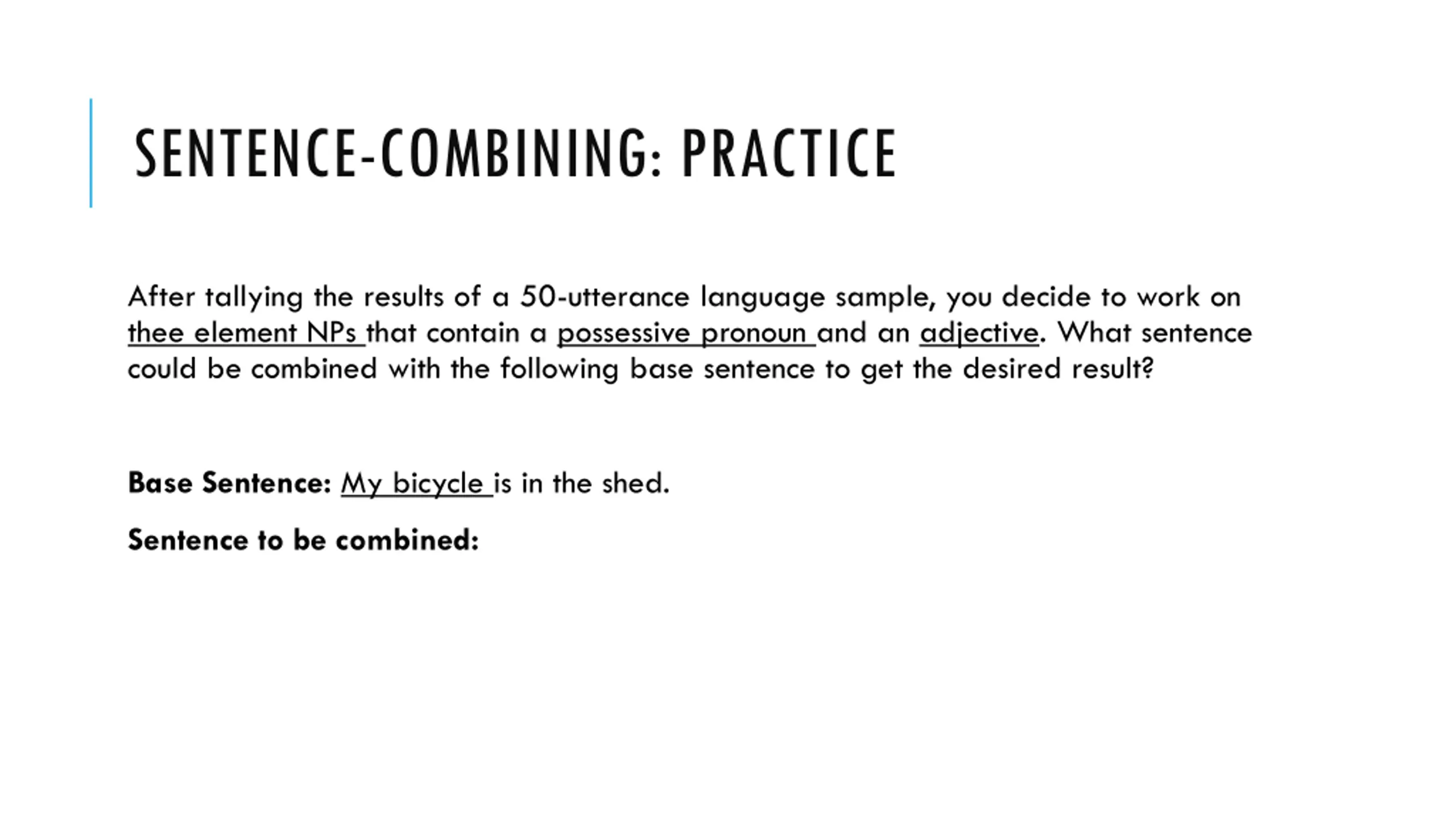 SENTENCE-COMBINING: PRACTICE After tallying the results of a 50-utterance language sample, you decide to work on thee element NPs that contain a possessive pronoun and an adjective. What sentence could be combined with the following base sentence to get the desired result? Base Sentence: My bicycle is in the shed. Sentence to be combined: