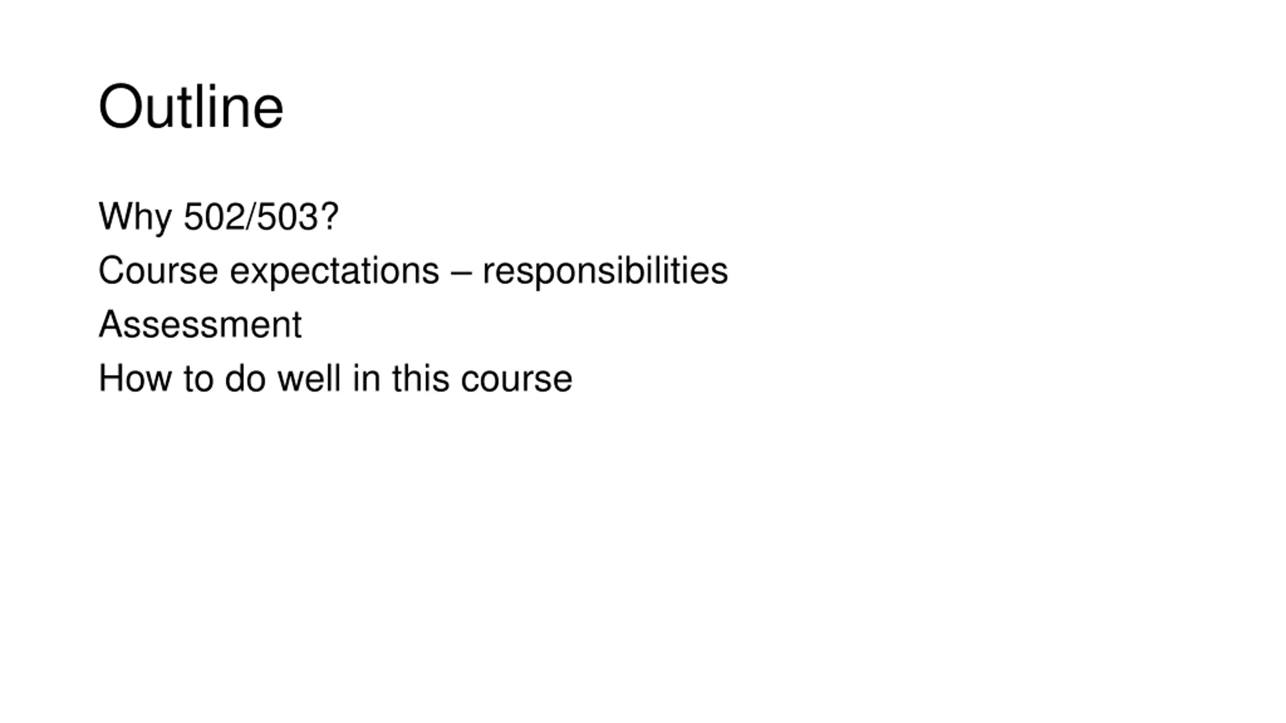 Outline Why 502/503? Course expectations responsibilities Assessment How to do well in this course
