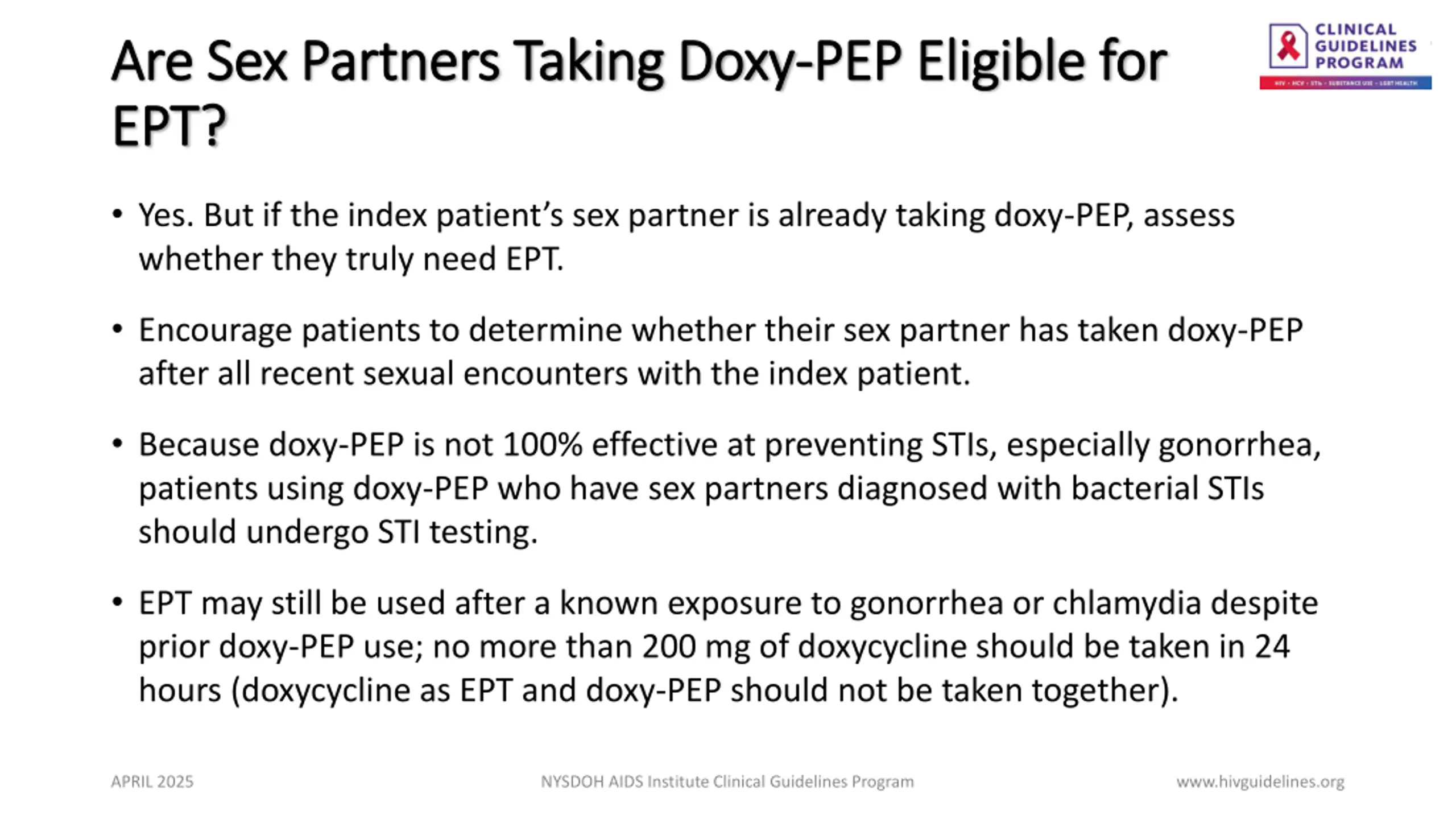 Are Sex Partners Taking Doxy Are Sex Partners Taking Doxy- -PEP Eligible for EPT? EPT? PEP Eligible for Yes. But if the index patient s sex partner is already taking doxy-PEP, assess whether they truly need EPT. Encourage patients to determine whether their sex partner has taken doxy-PEP after all recent sexual encounters with the index patient. Because doxy-PEP is not 100% effective at preventing STIs, especially gonorrhea, patients using doxy-PEP who have sex partners diagnosed with bacterial STIs should undergo STI testing. EPT may still be used after a known exposure to gonorrhea or chlamydia despite prior doxy-PEP use; no more than 200 mg of doxycycline should be taken in 24 hours (doxycycline as EPT and doxy-PEP should not be taken together). APRIL 2025 NYSDOH AIDS Institute Clinical Guidelines Program www.hivguidelines.org