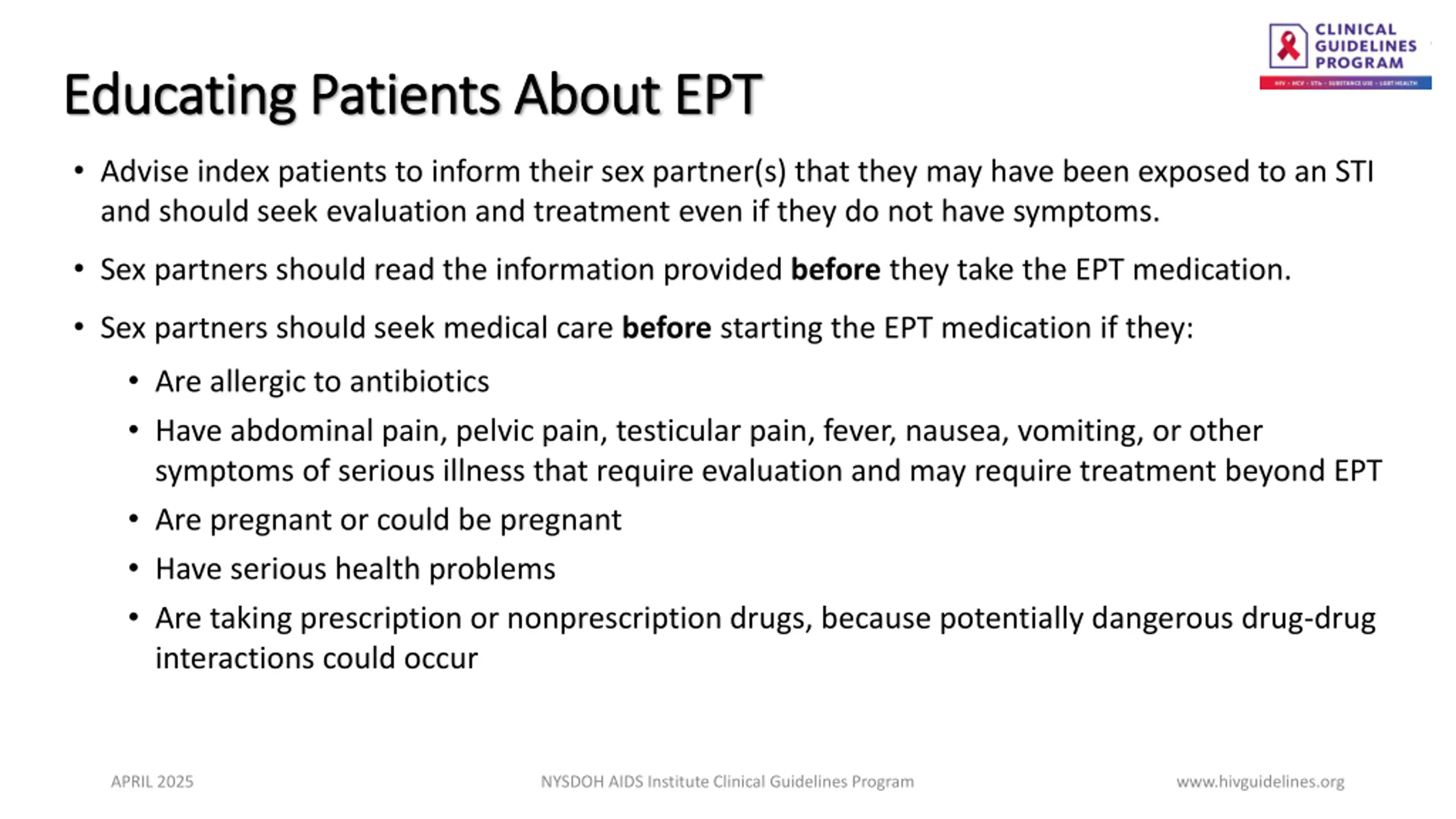 Educating Patients About EPT Educating Patients About EPT Advise index patients to inform their sex partner(s) that they may have been exposed to an STI and should seek evaluation and treatment even if they do not have symptoms. Sex partners should read the information provided before they take the EPT medication. Sex partners should seek medical care before starting the EPT medication if they: Are allergic to antibiotics Have abdominal pain, pelvic pain, testicular pain, fever, nausea, vomiting, or other symptoms of serious illness that require evaluation and may require treatment beyond EPT Are pregnant or could be pregnant Have serious health problems Are taking prescription or nonprescription drugs, because potentially dangerous drug-drug interactions could occur APRIL 2025 NYSDOH AIDS Institute Clinical Guidelines Program www.hivguidelines.org