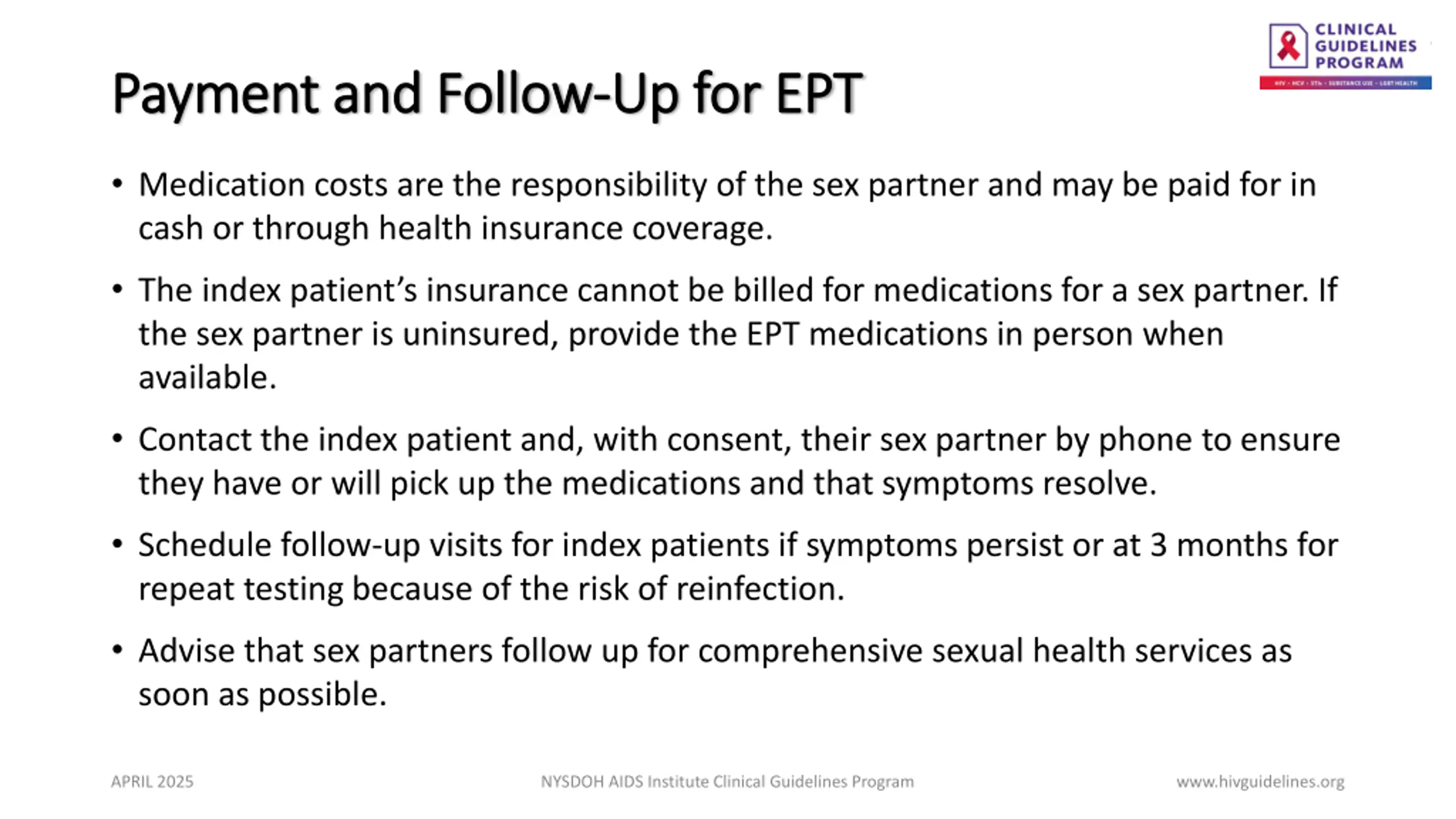 Payment and Follow Payment and Follow- -Up for EPT Up for EPT Medication costs are the responsibility of the sex partner and may be paid for in cash or through health insurance coverage. The index patient s insurance cannot be billed for medications for a sex partner. If the sex partner is uninsured, provide the EPT medications in person when available. Contact the index patient and, with consent, their sex partner by phone to ensure they have or will pick up the medications and that symptoms resolve. Schedule follow-up visits for index patients if symptoms persist or at 3 months for repeat testing because of the risk of reinfection. Advise that sex partners follow up for comprehensive sexual health services as soon as possible. APRIL 2025 NYSDOH AIDS Institute Clinical Guidelines Program www.hivguidelines.org