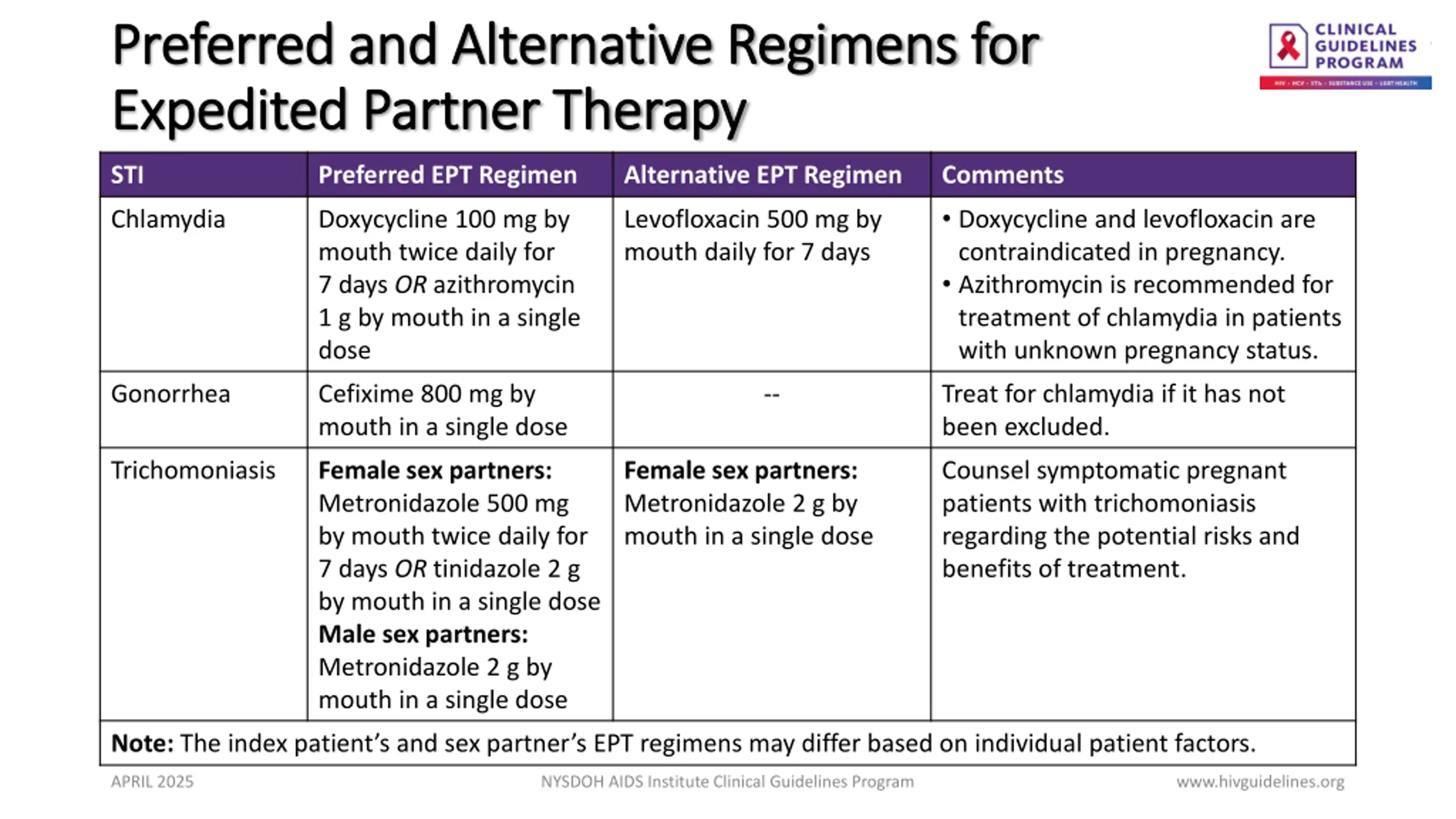 Questions, Answers, and Best Practices for Expedited Partner Therapy (EPT) www.hivguidelines.org APRIL 2025 NYSDOH AIDS Institute Clinical Guidelines Program