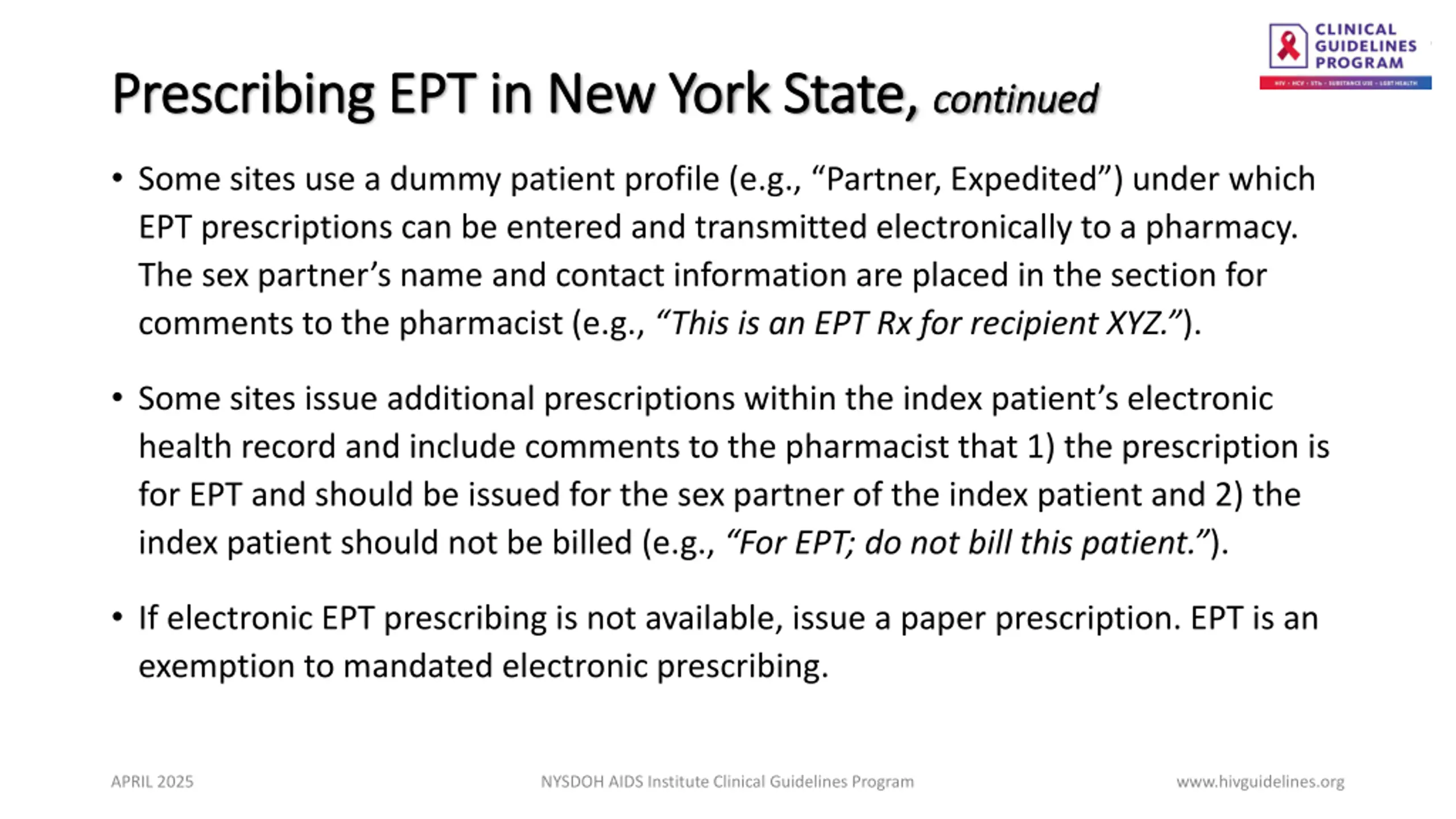 Prescribing EPT in New York State, Prescribing EPT in New York State, continued continued Some sites use a dummy patient profile (e.g., Partner, Expedited ) under which EPT prescriptions can be entered and transmitted electronically to a pharmacy. The sex partner s name and contact information are placed in the section for comments to the pharmacist (e.g., This is an EPT Rx for recipient XYZ. ). Some sites issue additional prescriptions within the index patient s electronic health record and include comments to the pharmacist that 1) the prescription is for EPT and should be issued for the sex partner of the index patient and 2) the index patient should not be billed (e.g., For EPT; do not bill this patient. ). If electronic EPT prescribing is not available, issue a paper prescription. EPT is an exemption to mandated electronic prescribing. APRIL 2025 NYSDOH AIDS Institute Clinical Guidelines Program www.hivguidelines.org