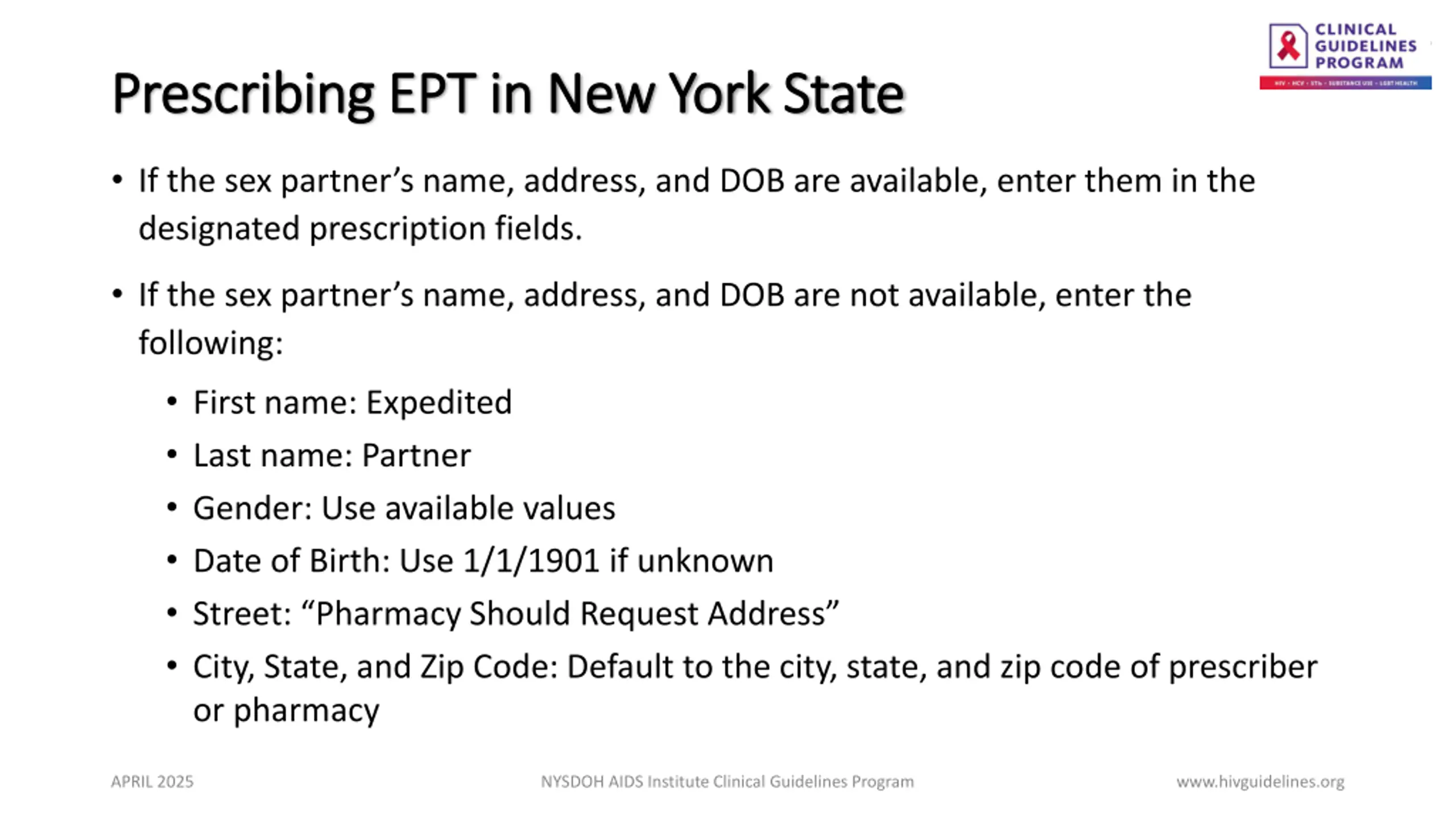 Prescribing EPT in New York State Prescribing EPT in New York State If the sex partner s name, address, and DOB are available, enter them in the designated prescription fields. If the sex partner s name, address, and DOB are not available, enter the following: First name: Expedited Last name: Partner Gender: Use available values Date of Birth: Use 1/1/1901 if unknown Street: Pharmacy Should Request Address City, State, and Zip Code: Default to the city, state, and zip code of prescriber or pharmacy APRIL 2025 NYSDOH AIDS Institute Clinical Guidelines Program www.hivguidelines.org