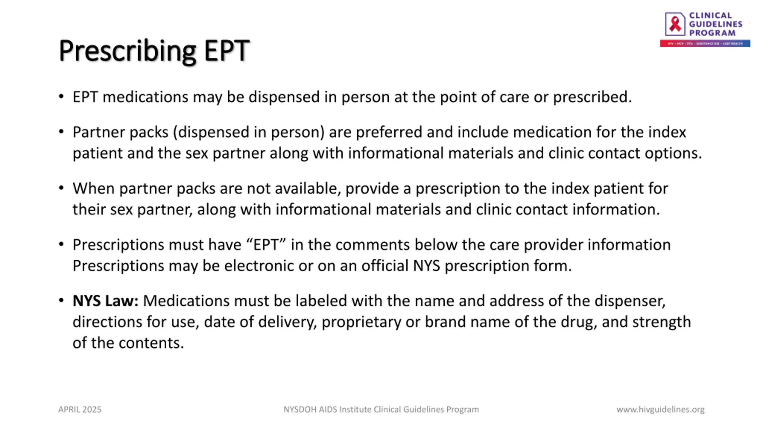 Prescribing EPT Prescribing EPT EPT medications may be dispensed in person at the point of care or prescribed. Partner packs (dispensed in person) are preferred and include medication for the index patient and the sex partner along with informational materials and clinic contact options. When partner packs are not available, provide a prescription to the index patient for their sex partner, along with informational materials and clinic contact information. Prescriptions must have EPT in the comments below the care provider information Prescriptions may be electronic or on an official NYS prescription form. NYS Law: Medications must be labeled with the name and address of the dispenser, directions for use, date of delivery, proprietary or brand name of the drug, and strength of the contents. APRIL 2025 NYSDOH AIDS Institute Clinical Guidelines Program www.hivguidelines.org