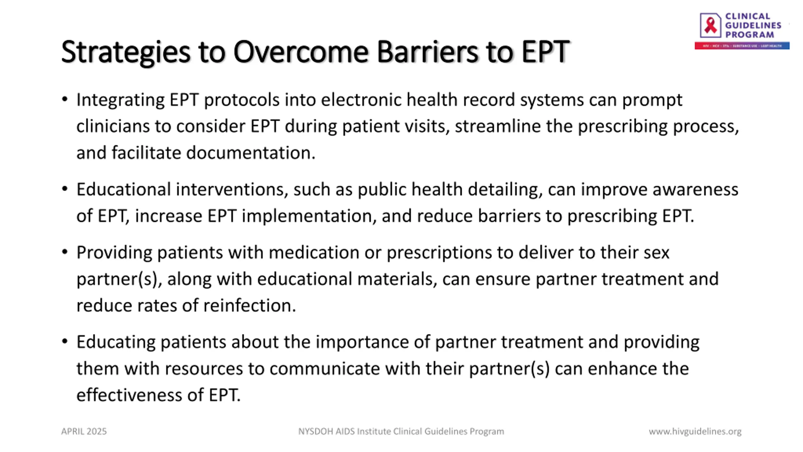 Strategies to Overcome Barriers to EPT Strategies to Overcome Barriers to EPT Integrating EPT protocols into electronic health record systems can prompt clinicians to consider EPT during patient visits, streamline the prescribing process, and facilitate documentation. Educational interventions, such as public health detailing, can improve awareness of EPT, increase EPT implementation, and reduce barriers to prescribing EPT. Providing patients with medication or prescriptions to deliver to their sex partner(s), along with educational materials, can ensure partner treatment and reduce rates of reinfection. Educating patients about the importance of partner treatment and providing them with resources to communicate with their partner(s) can enhance the effectiveness of EPT. APRIL 2025 NYSDOH AIDS Institute Clinical Guidelines Program www.hivguidelines.org