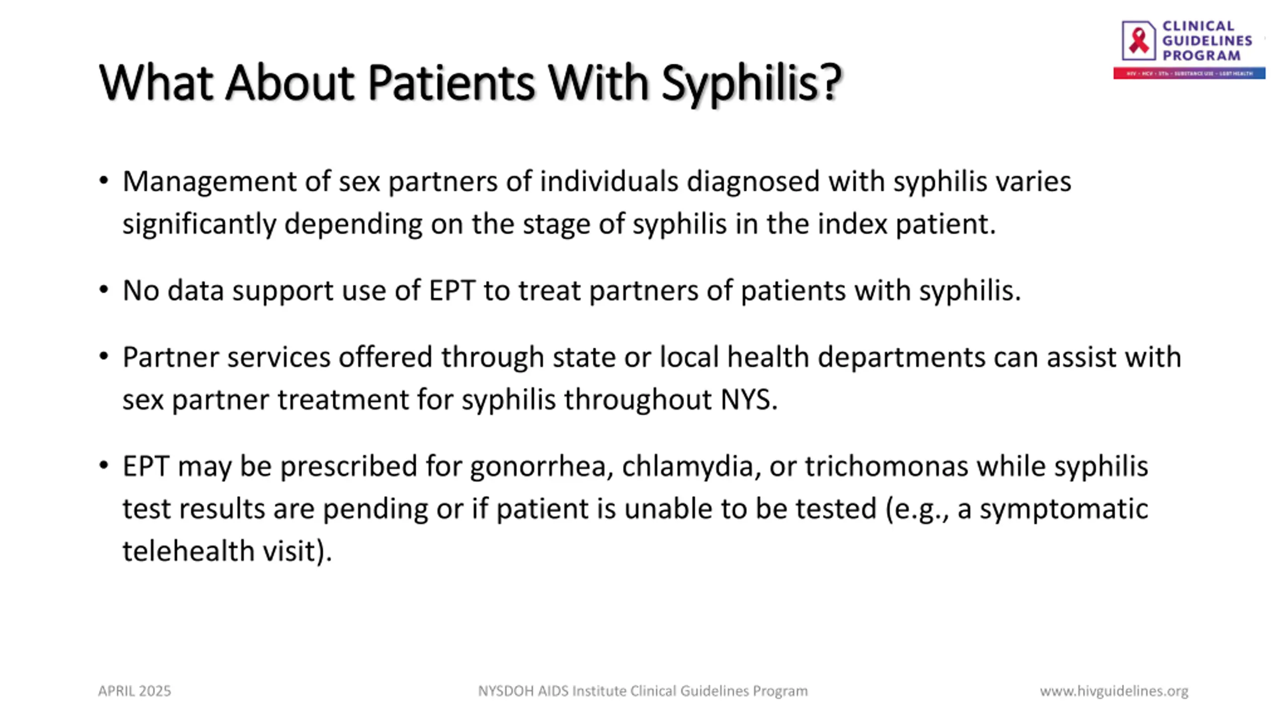 What About Patients With Syphilis? What About Patients With Syphilis? Management of sex partners of individuals diagnosed with syphilis varies significantly depending on the stage of syphilis in the index patient. No data support use of EPT to treat partners of patients with syphilis. Partner services offered through state or local health departments can assist with sex partner treatment for syphilis throughout NYS. EPT may be prescribed for gonorrhea, chlamydia, or trichomonas while syphilis test results are pending or if patient is unable to be tested (e.g., a symptomatic telehealth visit). APRIL 2025 NYSDOH AIDS Institute Clinical Guidelines Program www.hivguidelines.org
