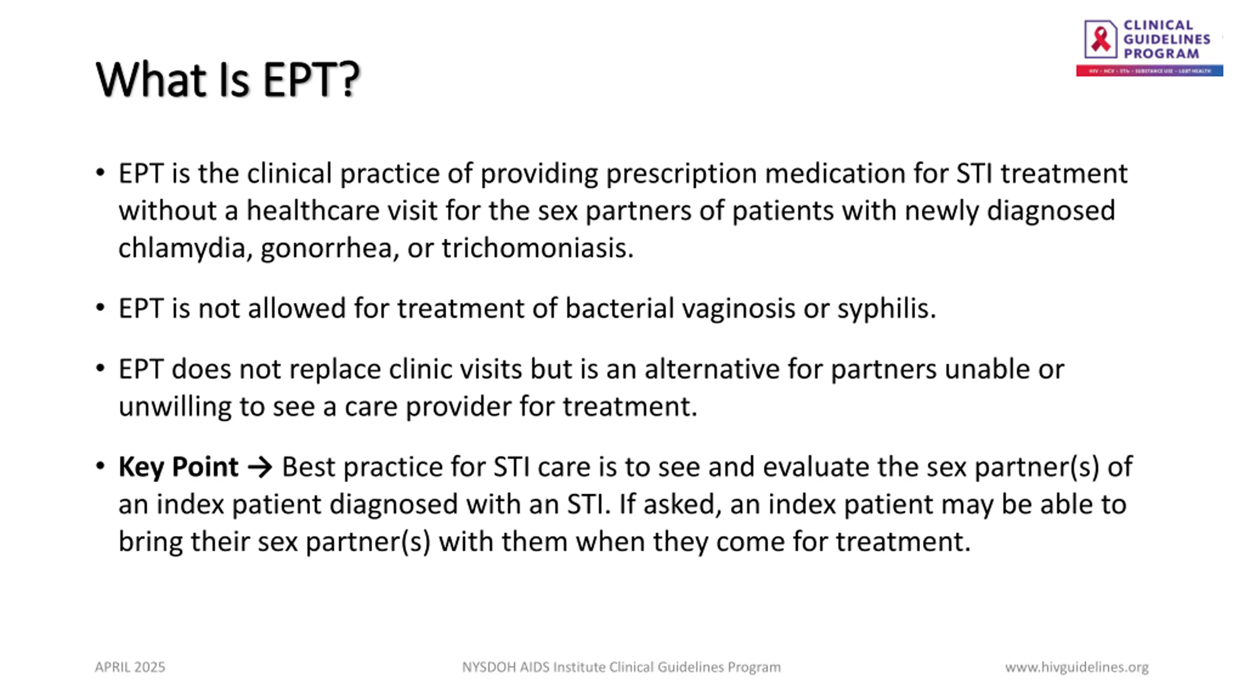What Is EPT? What Is EPT? EPT is the clinical practice of providing prescription medication for STI treatment without a healthcare visit for the sex partners of patients with newly diagnosed chlamydia, gonorrhea, or trichomoniasis. EPT is not allowed for treatment of bacterial vaginosis or syphilis. EPT does not replace clinic visits but is an alternative for partners unable or unwilling to see a care provider for treatment. Key Point Best practice for STI care is to see and evaluate the sex partner(s) of an index patient diagnosed with an STI. If asked, an index patient may be able to bring their sex partner(s) with them when they come for treatment. APRIL 2025 NYSDOH AIDS Institute Clinical Guidelines Program www.hivguidelines.org