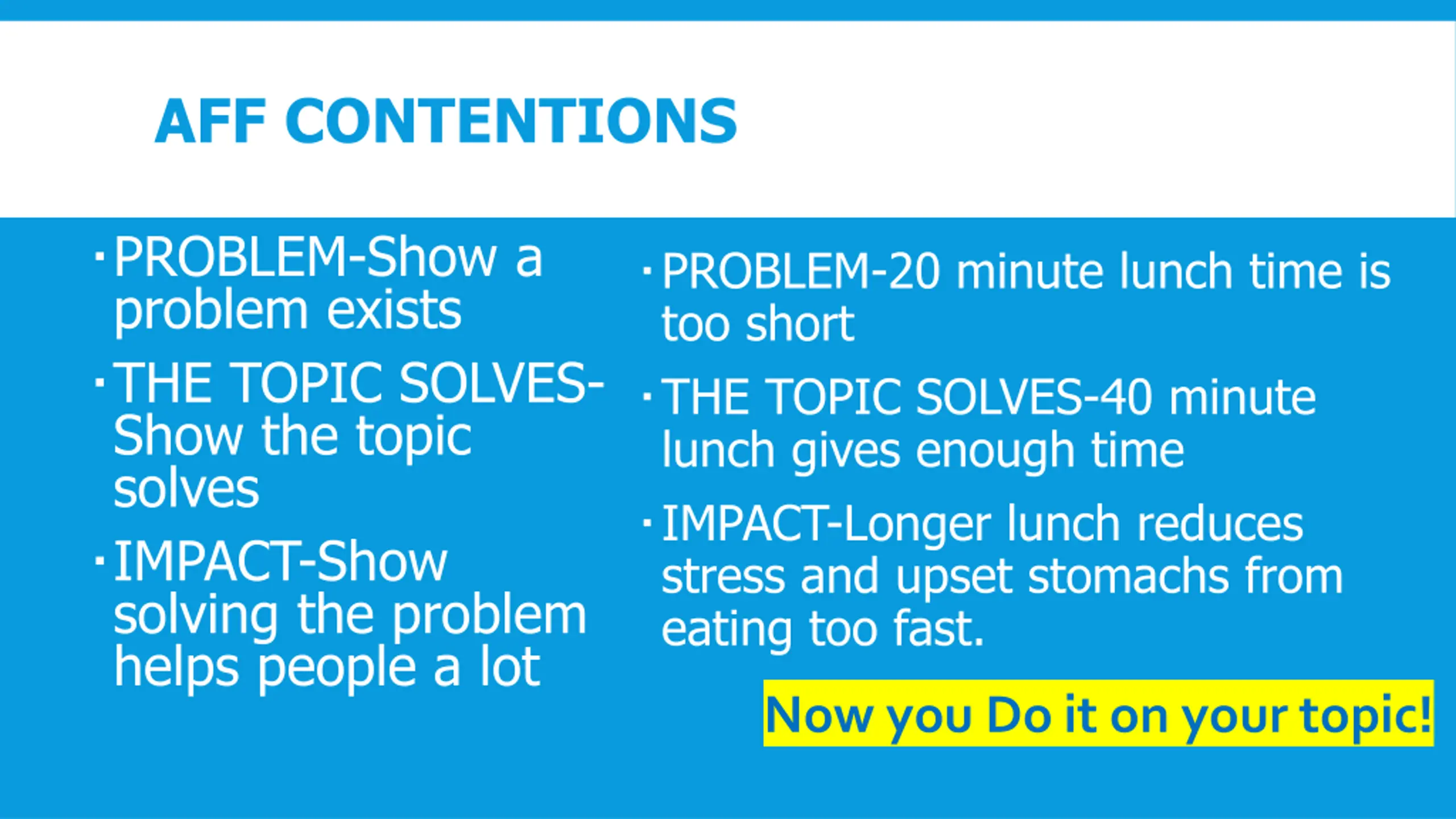 AFF CONTENTIONS PROBLEM-Show a problem exists THE TOPIC SOLVES- Show the topic solves IMPACT-Show solving the problem helps people a lot PROBLEM-20 minute lunch time is too short THE TOPIC SOLVES-40 minute lunch gives enough time IMPACT-Longer lunch reduces stress and upset stomachs from eating too fast. Now you Do it on your topic!