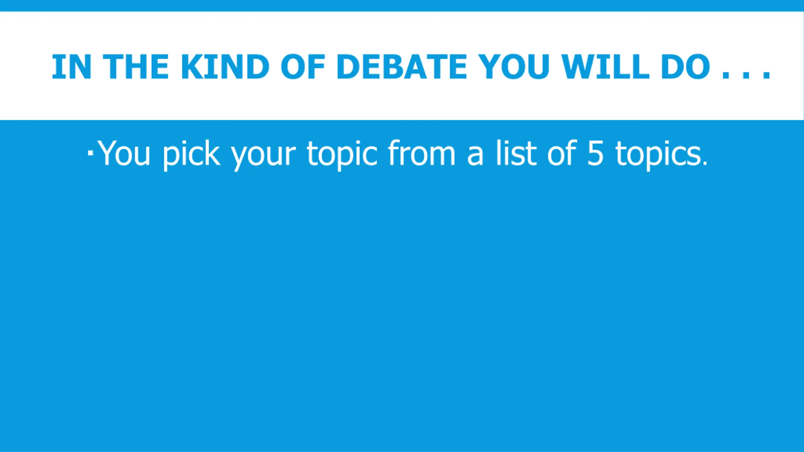 IN THE KIND OF DEBATE YOU WILL DO . . . You pick your topic from a list of 5 topics.
