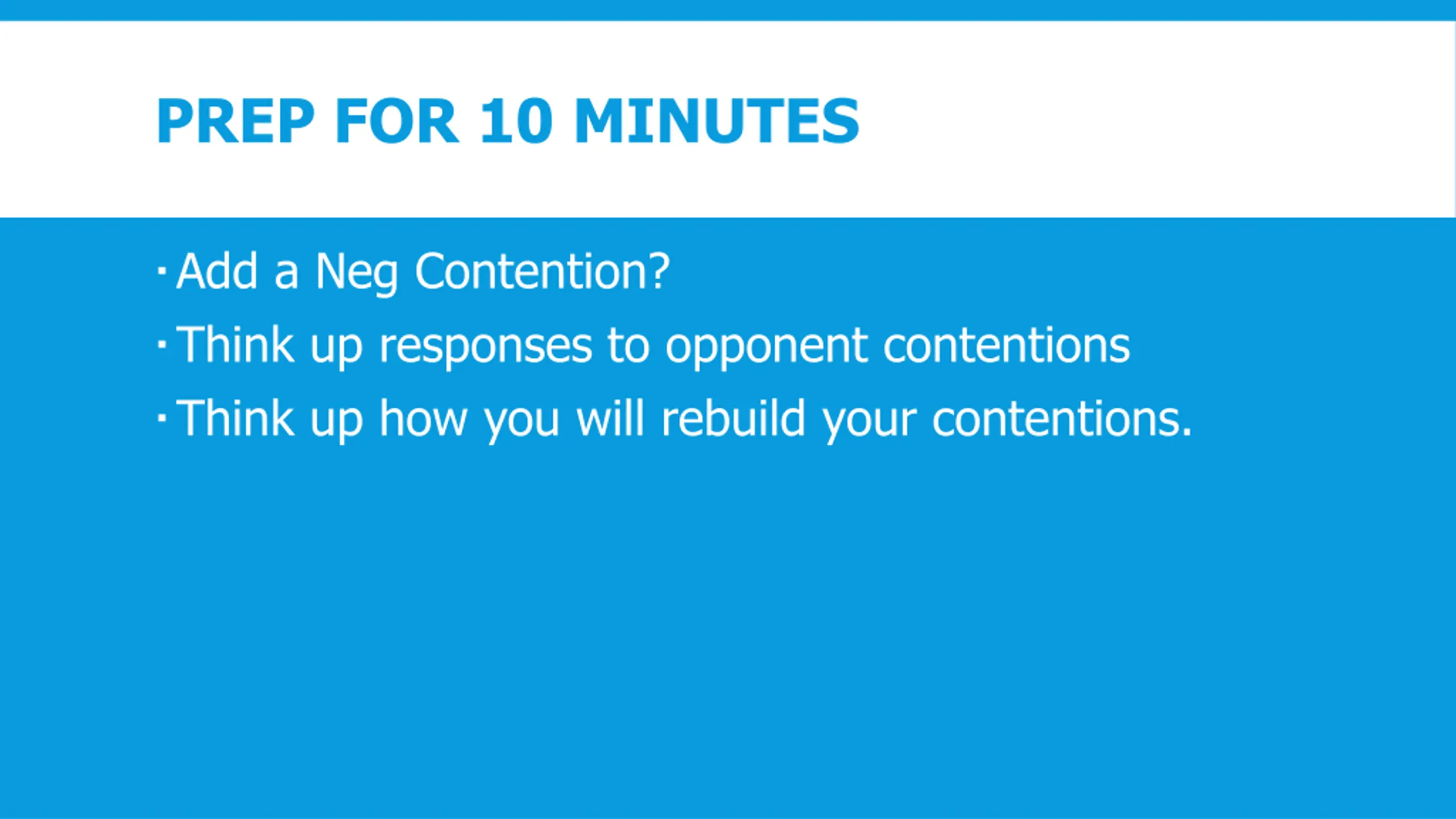 PREP FOR 10 MINUTES Add a Neg Contention? Think up responses to opponent contentions Think up how you will rebuild your contentions.