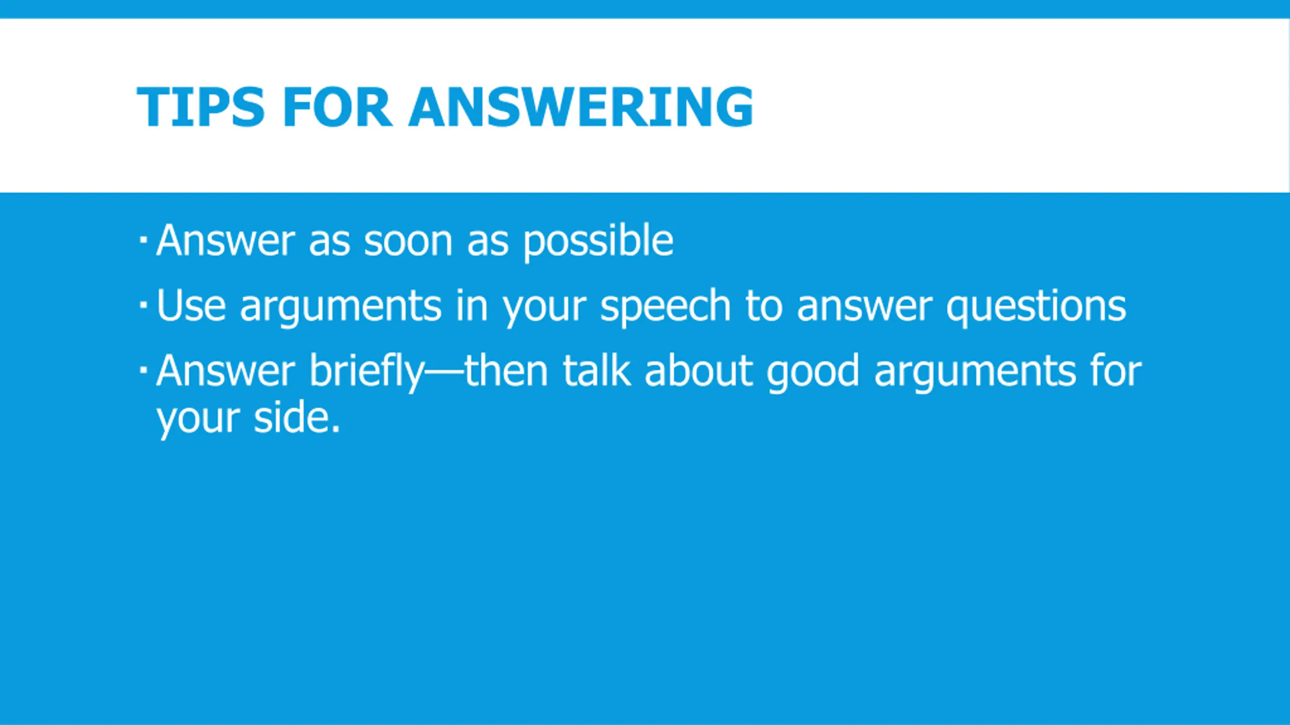 TIPS FOR ANSWERING Answer as soon as possible Use arguments in your speech to answer questions Answer briefly then talk about good arguments for your side.