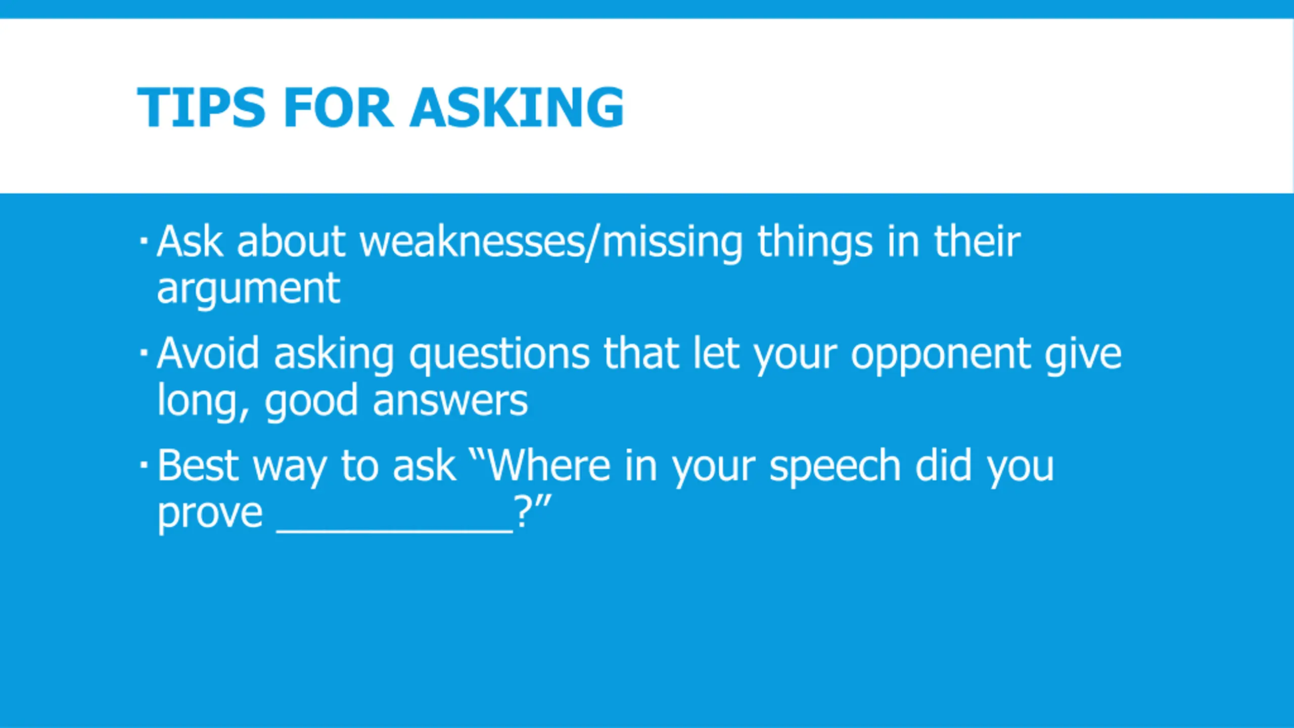 TIPS FOR ASKING Ask about weaknesses/missing things in their argument Avoid asking questions that let your opponent give long, good answers Best way to ask Where in your speech did you prove __________?