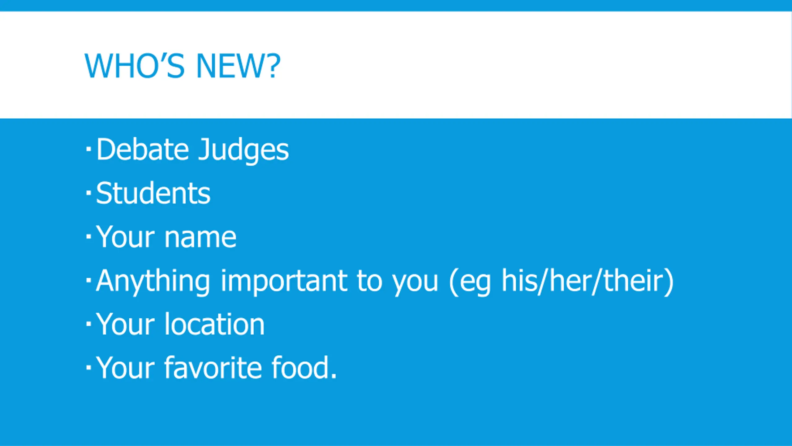 WHOS NEW? Debate Judges Students Your name Anything important to you (eg his/her/their) Your location Your favorite food.