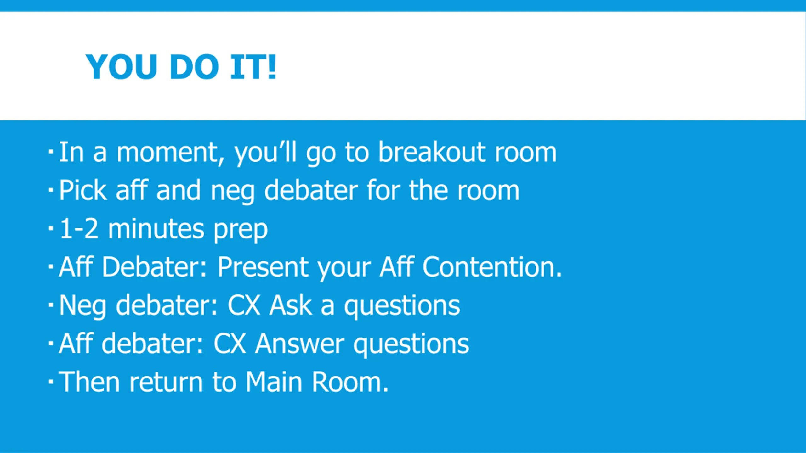 YOU DO IT! In a moment, you ll go to breakout room Pick aff and neg debater for the room 1-2 minutes prep Aff Debater: Present your Aff Contention. Neg debater: CX Ask a questions Aff debater: CX Answer questions Then return to Main Room.