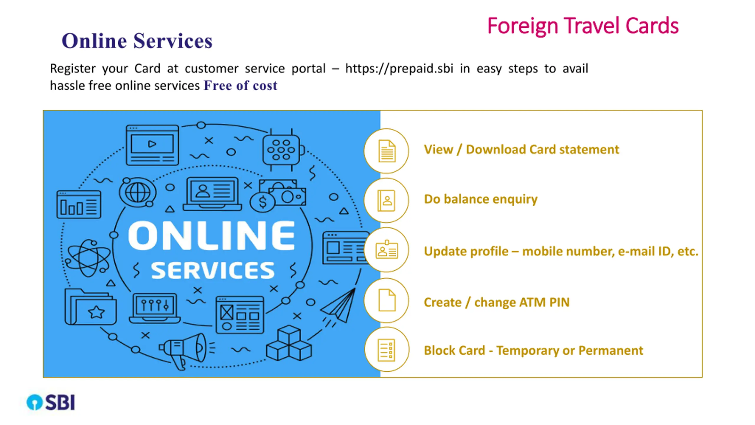 Foreign Travel Cards Foreign Travel Cards Online Services Register your Card at customer service portal https://prepaid.sbi in easy steps to avail hassle free online services Free of cost View / Download Card statement Do balance enquiry Update profile mobile number, e-mail ID, etc. Create / change ATM PIN Block Card - Temporary or Permanent