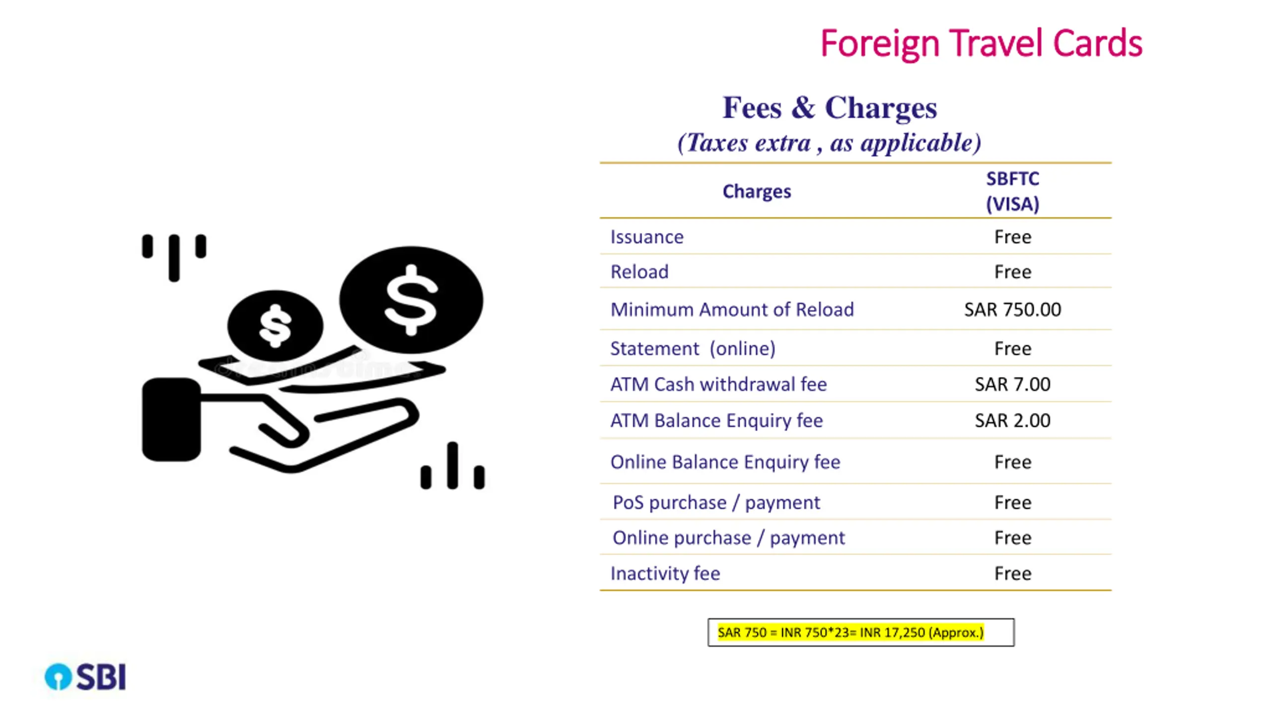 Foreign Travel Cards Foreign Travel Cards Fees & Charges (Taxes extra , as applicable) SBFTC (VISA) Charges Issuance Free Reload Free Minimum Amount of Reload SAR 750.00 Statement (online) Free ATM Cash withdrawal fee SAR 7.00 ATM Balance Enquiry fee SAR 2.00 Online Balance Enquiry fee Free PoS purchase / payment Free Online purchase / payment Free Inactivity fee Free SAR 750 = INR 750*23= INR 17,250 (Approx.)