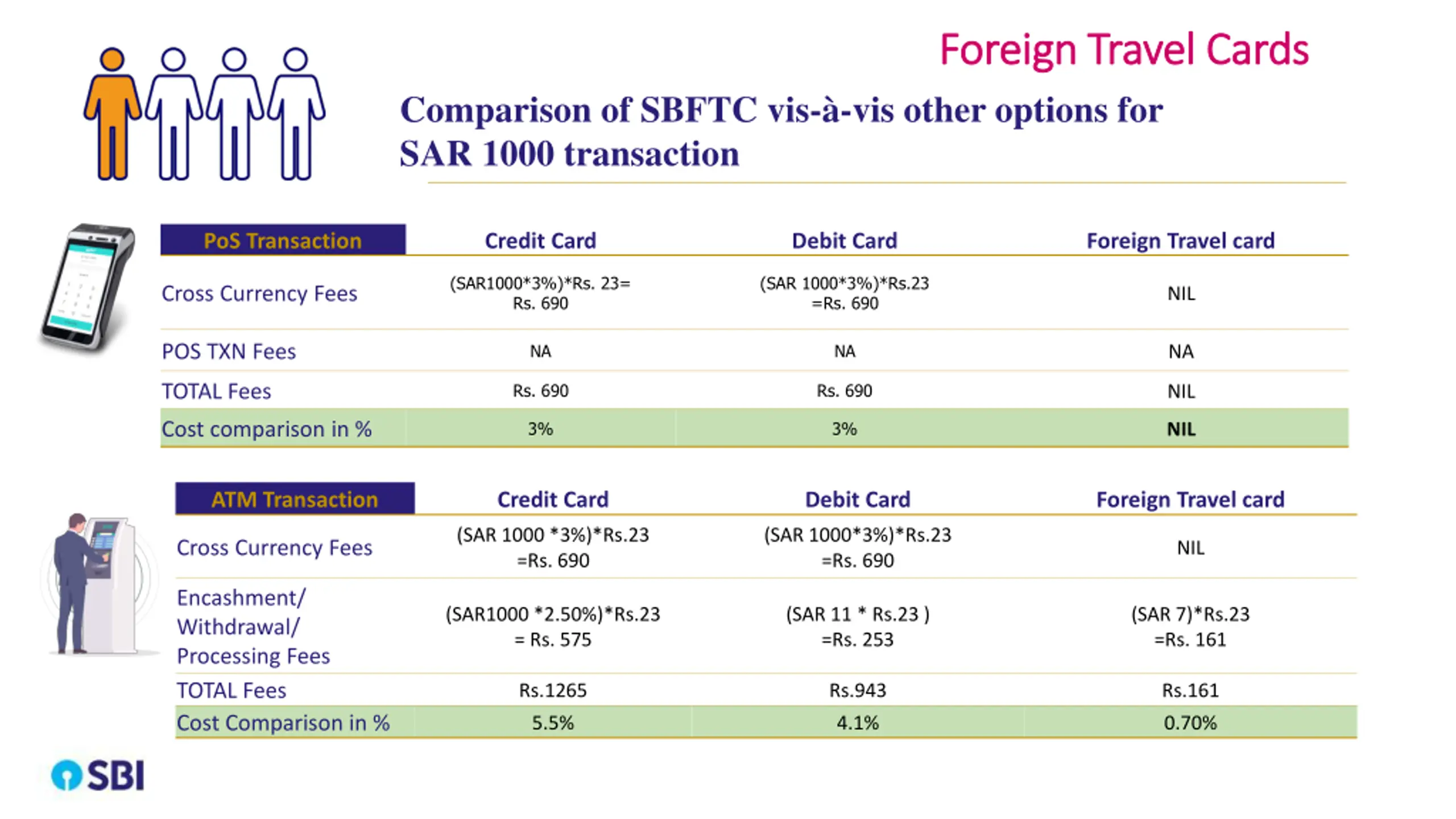 Foreign Travel Cards Foreign Travel Cards Comparison of SBFTC vis- -vis other options for SAR 1000 transaction PoS Transaction Credit Card Debit Card Foreign Travel card (SAR1000*3%)*Rs. 23= Rs. 690 (SAR 1000*3%)*Rs.23 =Rs. 690 Cross Currency Fees NIL NA NA POS TXN Fees NA Rs. 690 Rs. 690 TOTAL Fees NIL 3% 3% Cost comparison in % NIL ATM Transaction Credit Card Debit Card Foreign Travel card (SAR 1000 *3%)*Rs.23 =Rs. 690 (SAR 1000*3%)*Rs.23 =Rs. 690 Cross Currency Fees NIL Encashment/ Withdrawal/ Processing Fees TOTAL Fees Cost Comparison in % (SAR1000 *2.50%)*Rs.23 = Rs. 575 (SAR 11 * Rs.23 ) =Rs. 253 (SAR 7)*Rs.23 =Rs. 161 Rs.1265 Rs.943 Rs.161 5.5% 4.1% 0.70%