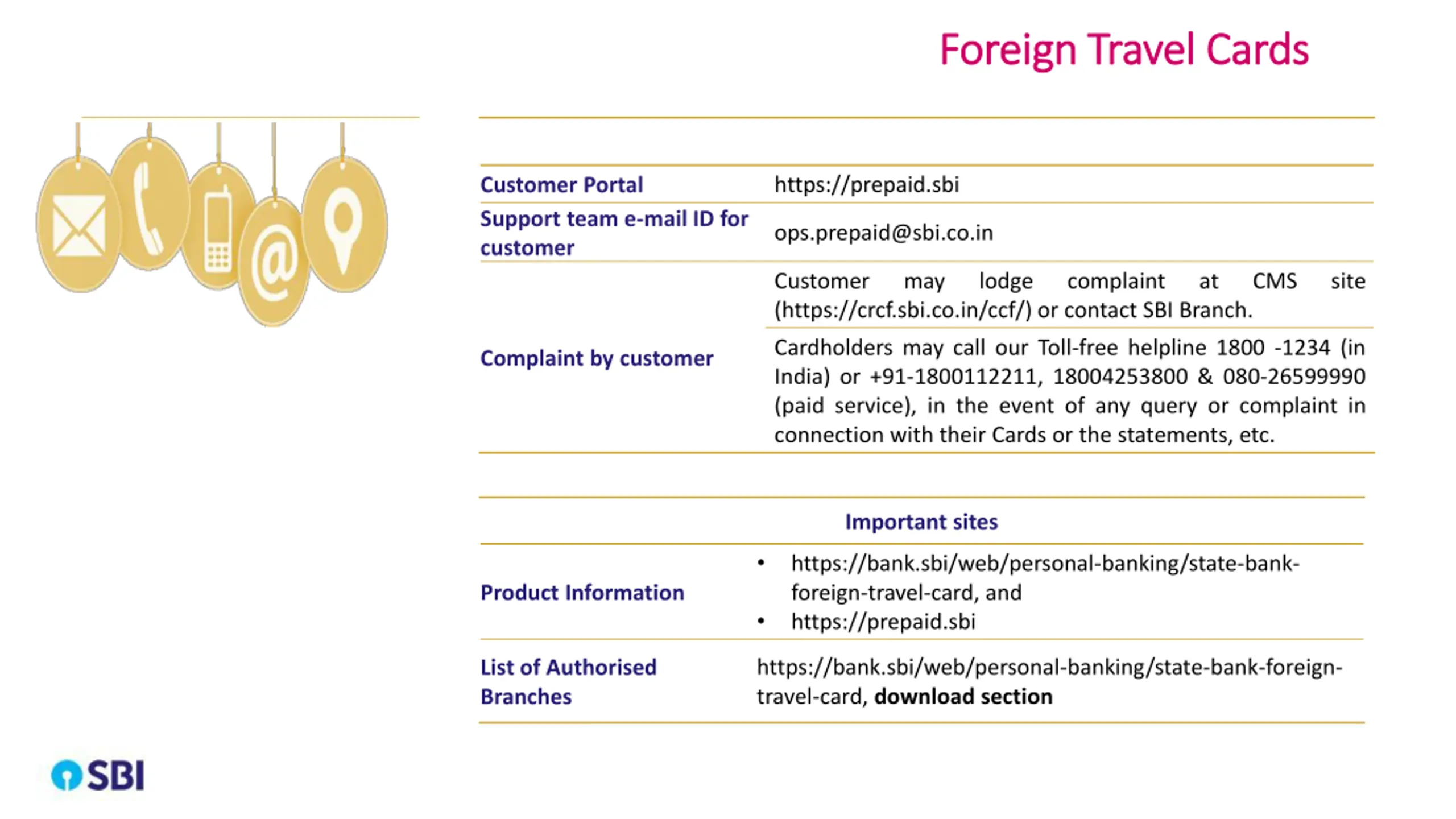 Foreign Travel Cards Foreign Travel Cards https://prepaid.sbi Customer Portal Support team e-mail ID for customer ops.prepaid@sbi.co.in Customer (https://crcf.sbi.co.in/ccf/) or contact SBI Branch. may lodge complaint at CMS site Cardholders may call our Toll-free helpline 1800 -1234 (in India) or +91-1800112211, 18004253800 & 080-26599990 (paid service), in the event of any query or complaint in connection with their Cards or the statements, etc. Complaint by customer Important sites https://bank.sbi/web/personal-banking/state-bank- foreign-travel-card, and https://prepaid.sbi Product Information https://bank.sbi/web/personal-banking/state-bank-foreign- travel-card, download section List of Authorised Branches