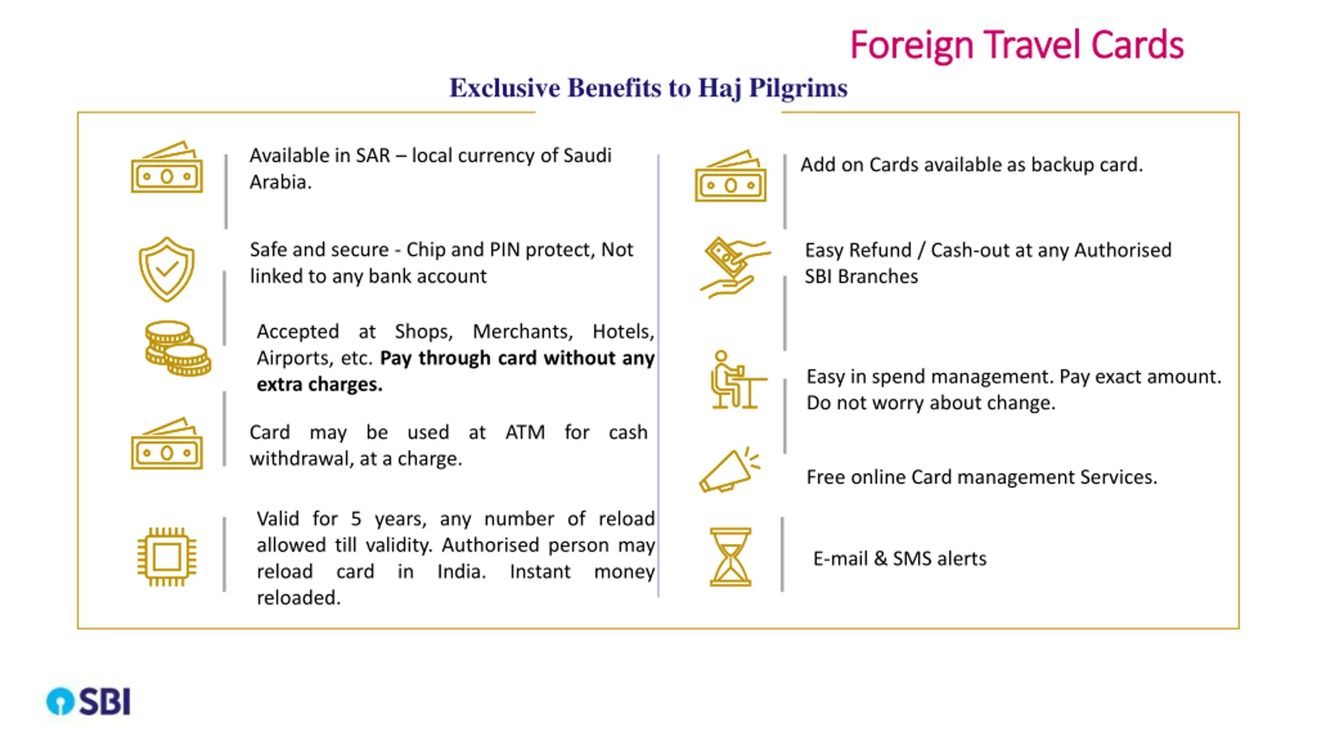 Foreign Travel Cards Foreign Travel Cards Exclusive Benefits to Haj Pilgrims Available in SAR local currency of Saudi Arabia. Add on Cards available as backup card. Safe and secure - Chip and PIN protect, Not linked to any bank account Easy Refund / Cash-out at any Authorised SBI Branches Accepted at Shops, Merchants, Hotels, Airports, etc. Pay through card without any extra charges. Easy in spend management. Pay exact amount. Do not worry about change. Card may be used at ATM for cash withdrawal, at a charge. Free online Card management Services. Valid for 5 years, any number of reload allowed till validity. Authorised person may reload card in India. Instant money reloaded. E-mail & SMS alerts
