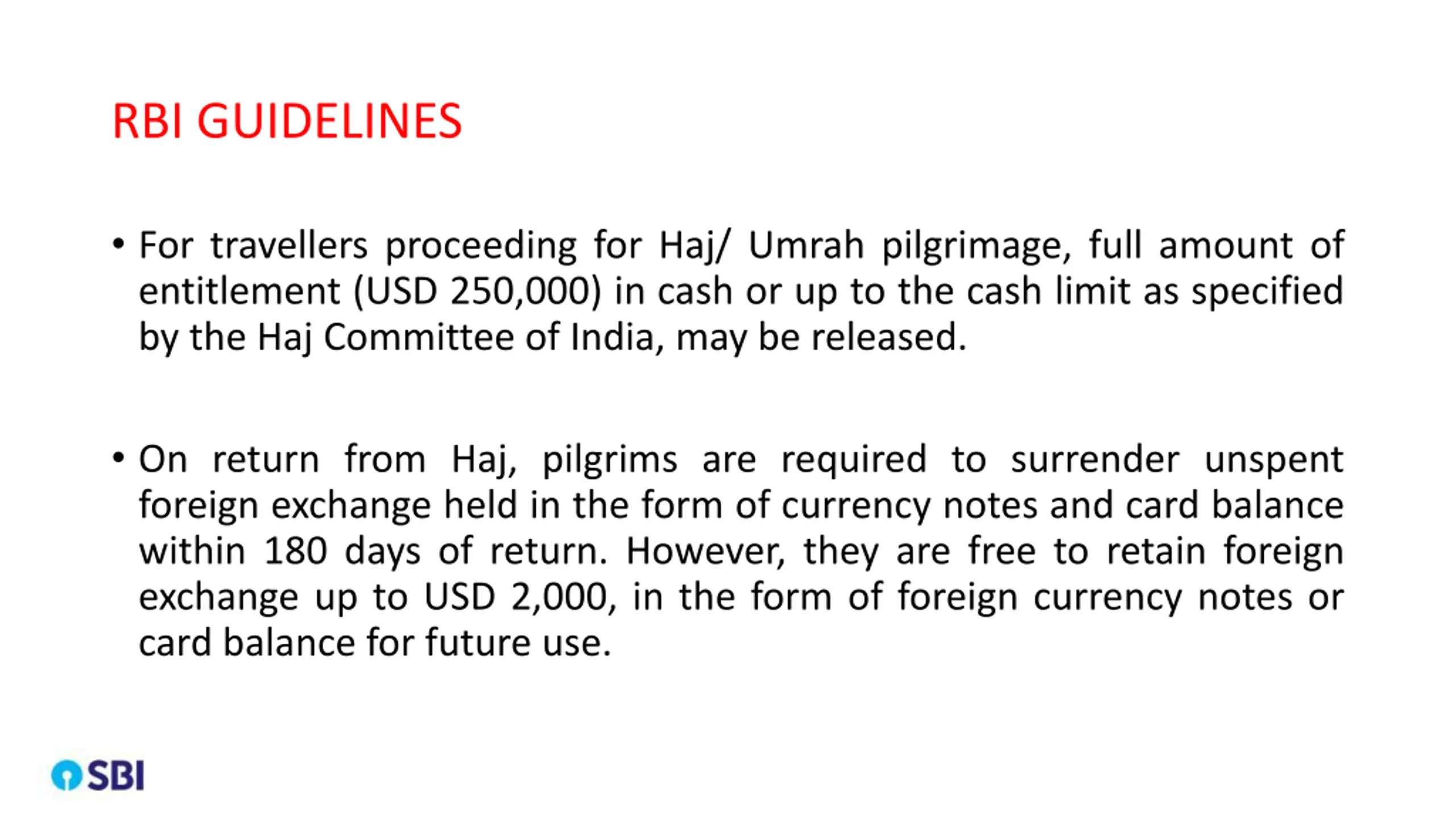 RBI GUIDELINES For travellers proceeding for Haj/ Umrah pilgrimage, full amount of entitlement (USD 250,000) in cash or up to the cash limit as specified by the Haj Committee of India, may be released. On return from Haj, pilgrims are required to surrender unspent foreign exchange held in the form of currency notes and card balance within 180 days of return. However, they are free to retain foreign exchange up to USD 2,000, in the form of foreign currency notes or card balance for future use.