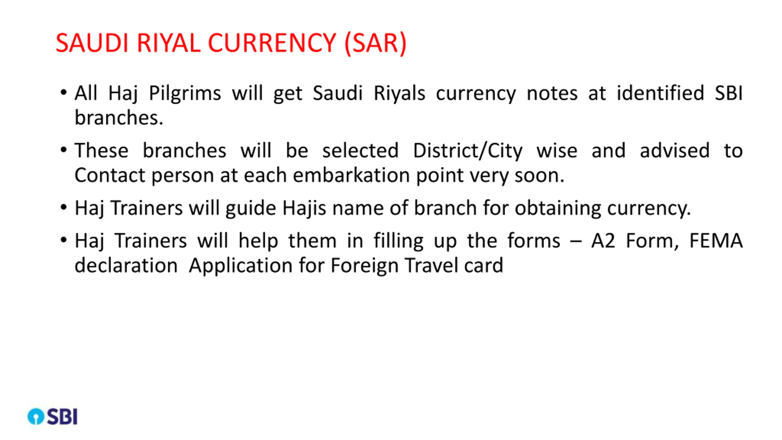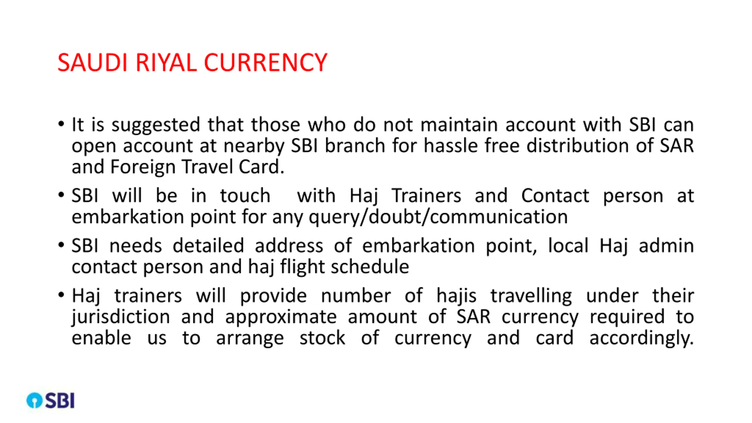 SAUDI RIYAL CURRENCY It is suggested that those who do not maintain account with SBI can open account at nearby SBI branch for hassle free distribution of SAR and Foreign Travel Card. SBI will be in touch with Haj Trainers and Contact person at embarkation point for any query/doubt/communication SBI needs detailed address of embarkation point, local Haj admin contact person and haj flight schedule Haj trainers will provide number of hajis travelling under their jurisdiction and approximate amount of SAR currency required to enable us to arrange stock of currency and card accordingly.