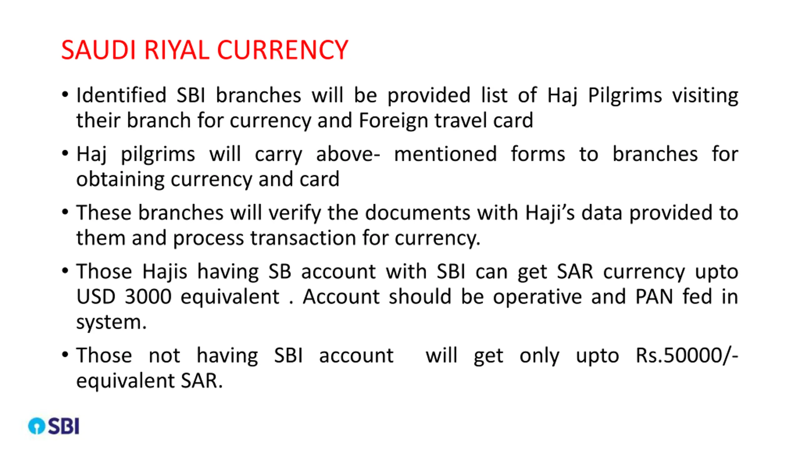 SAUDI RIYAL CURRENCY Identified SBI branches will be provided list of Haj Pilgrims visiting their branch for currency and Foreign travel card Haj pilgrims will carry above- mentioned forms to branches for obtaining currency and card These branches will verify the documents with Haji s data provided to them and process transaction for currency. Those Hajis having SB account with SBI can get SAR currency upto USD 3000 equivalent . Account should be operative and PAN fed in system. Those not having SBI account will get only upto Rs.50000/- equivalent SAR.