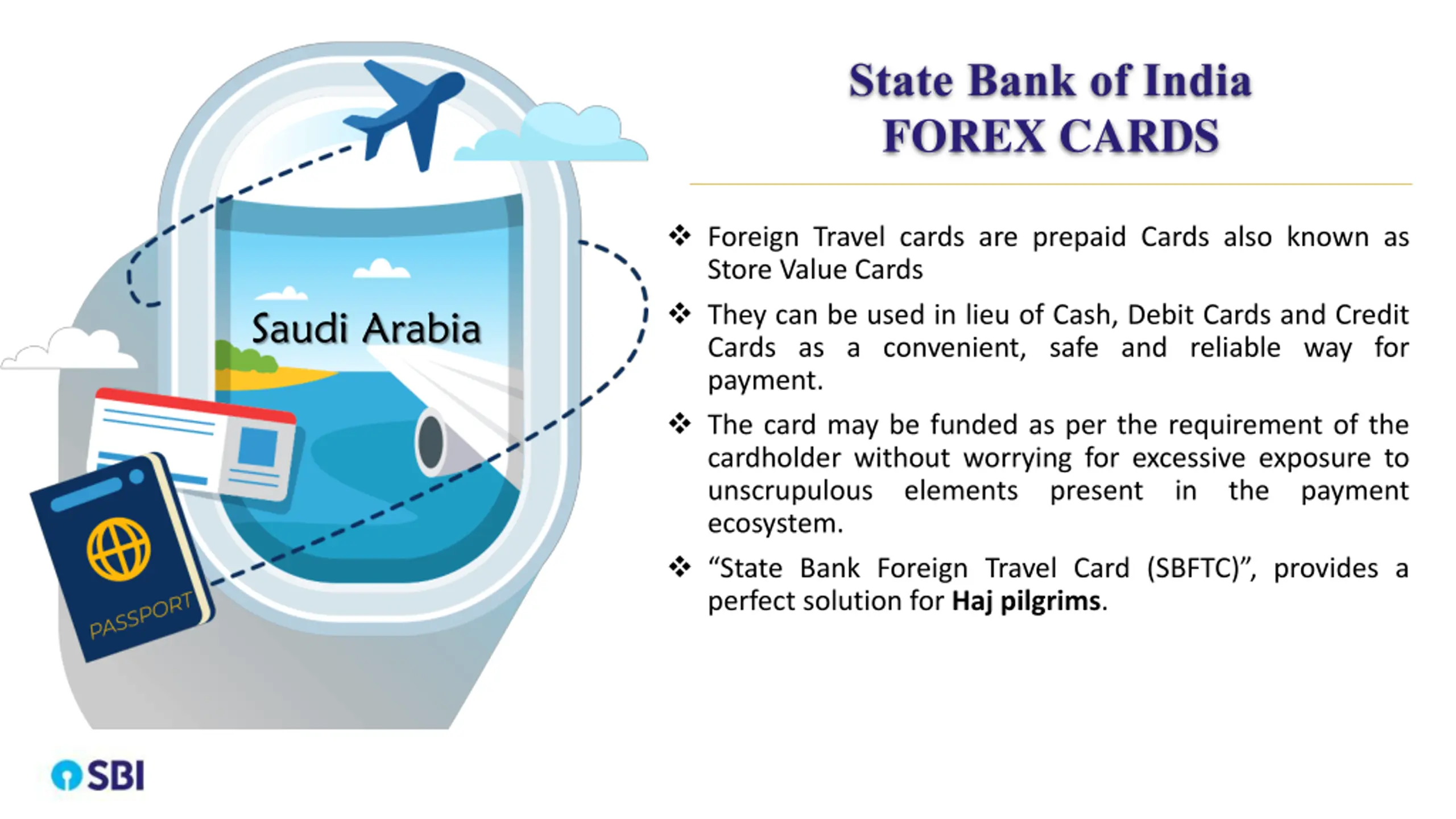 State Bank of India FOREX CARDS Foreign Travel cards are prepaid Cards also known as Store Value Cards They can be used in lieu of Cash, Debit Cards and Credit Cards as a convenient, safe and reliable way for payment. The card may be funded as per the requirement of the cardholder without worrying for excessive exposure to unscrupulous elements present in the payment ecosystem. State Bank Foreign Travel Card (SBFTC) , provides a perfect solution for Haj pilgrims. Saudi Arabia