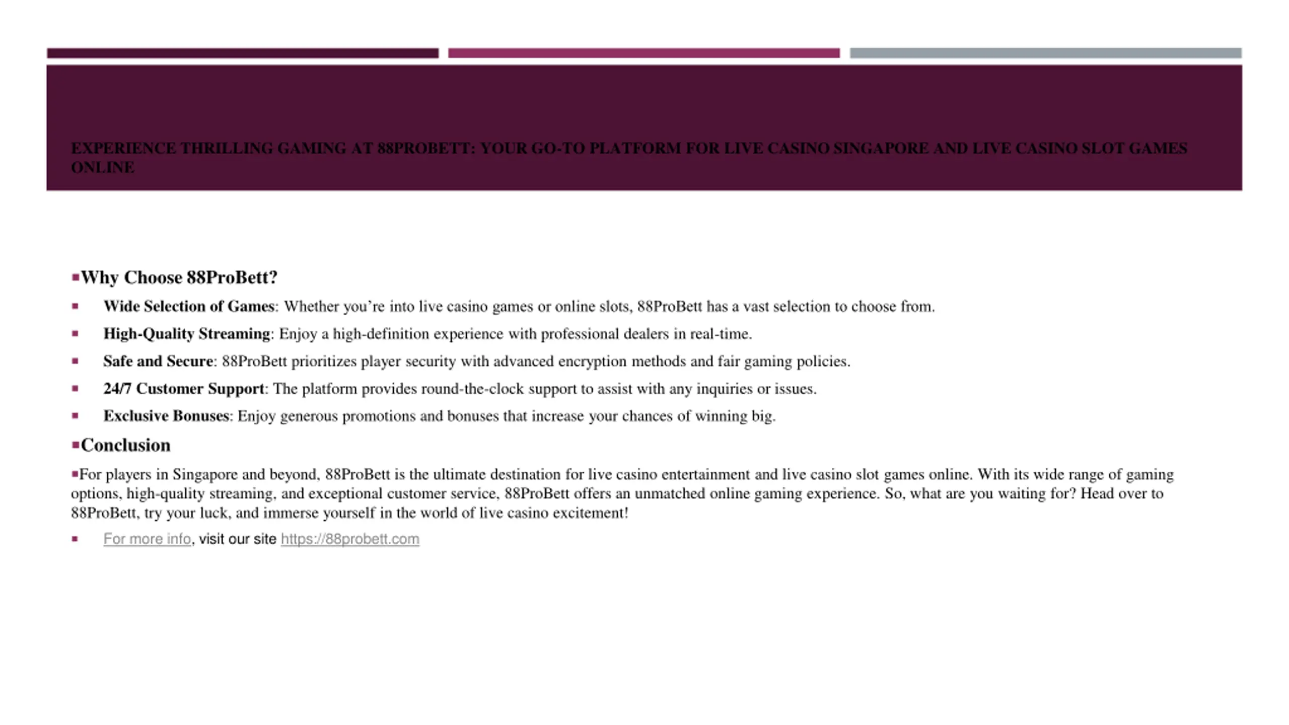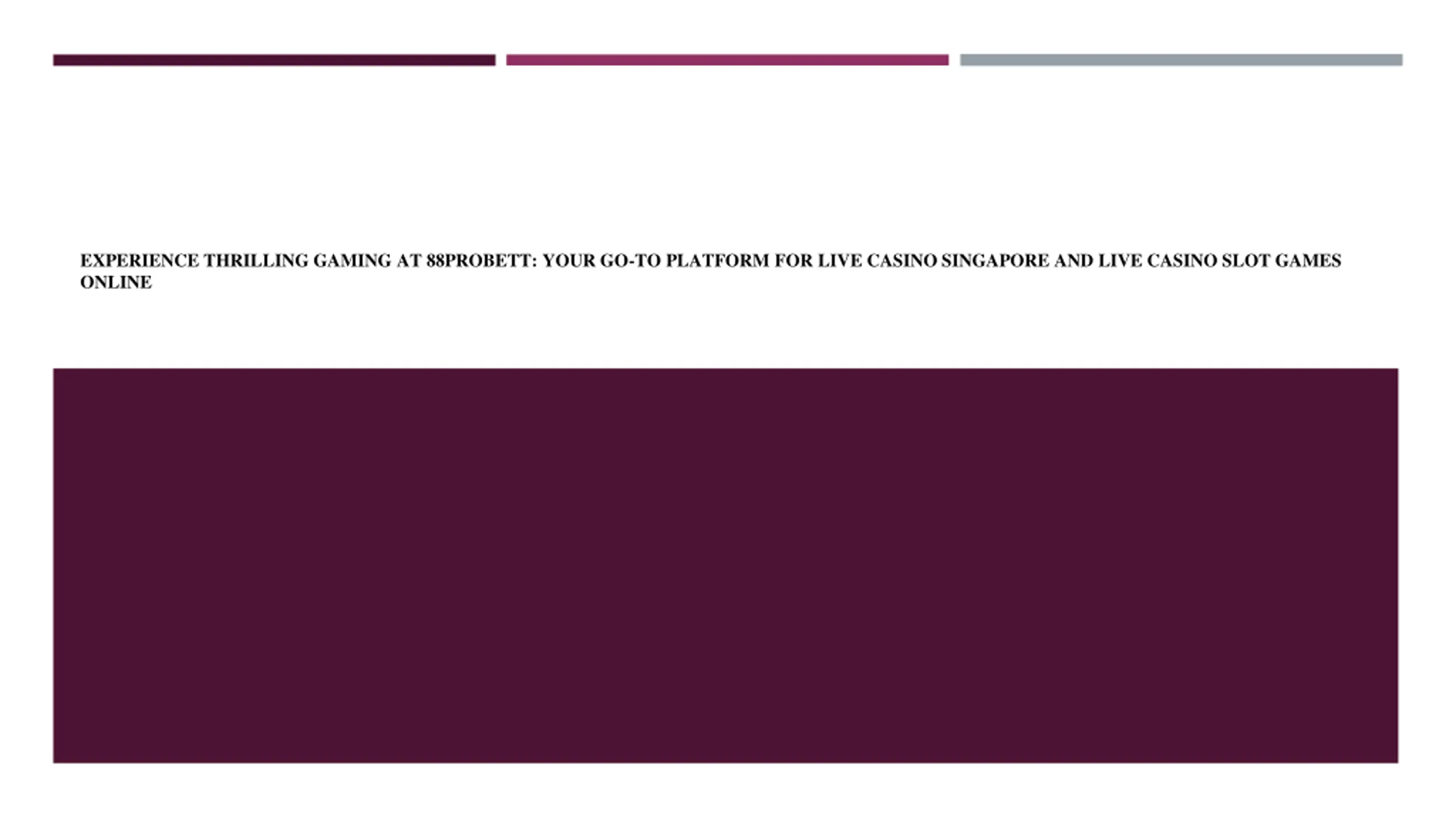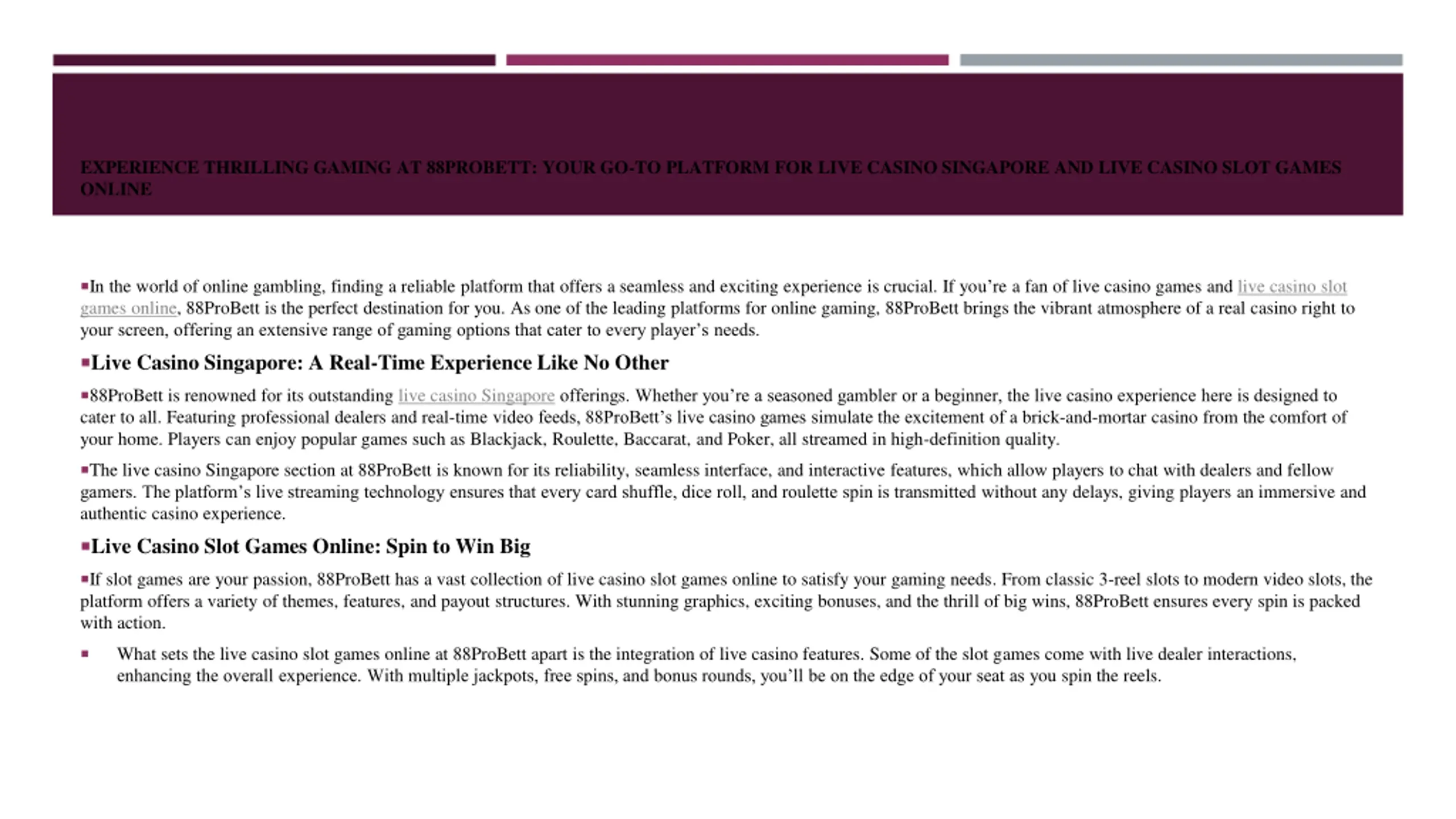 EXPERIENCE THRILLING GAMING AT 88PROBETT: YOUR GO-TO PLATFORM FOR LIVE CASINO SINGAPORE AND LIVE CASINO SLOT GAMES ONLINE Why Choose 88ProBett? Wide Selection of Games: Whether you re into live casino games or online slots, 88ProBett has a vast selection to choose from. High-Quality Streaming: Enjoy a high-definition experience with professional dealers in real-time. Safe and Secure: 88ProBett prioritizes player security with advanced encryption methods and fair gaming policies. 24/7 Customer Support: The platform provides round-the-clock support to assist with any inquiries or issues. Exclusive Bonuses: Enjoy generous promotions and bonuses that increase your chances of winning big. Conclusion For players in Singapore and beyond, 88ProBett is the ultimate destination for live casino entertainment and live casino slot games online. With its wide range of gaming options, high-quality streaming, and exceptional customer service, 88ProBett offers an unmatched online gaming experience. So, what are you waiting for? Head over to 88ProBett, try your luck, and immerse yourself in the world of live casino excitement! For more info, visit our site https://88probett.com