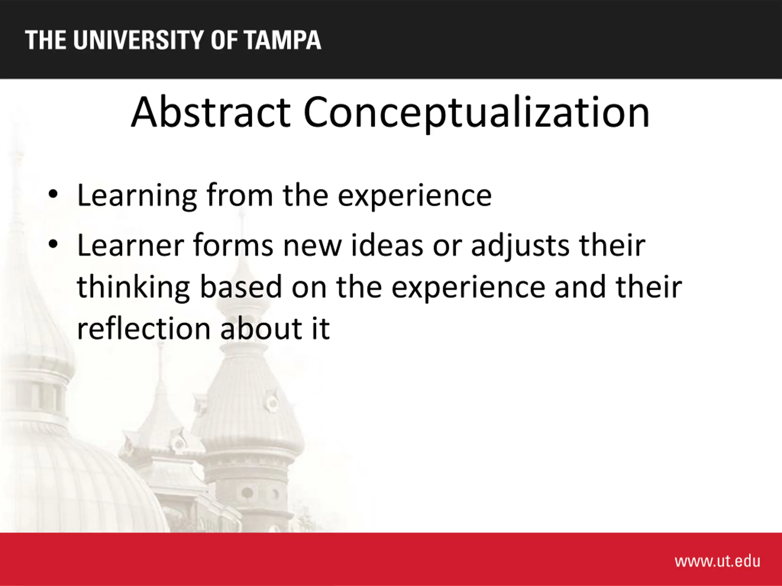 Abstract Conceptualization Learning from the experience Learner forms new ideas or adjusts their thinking based on the experience and their reflection about it
