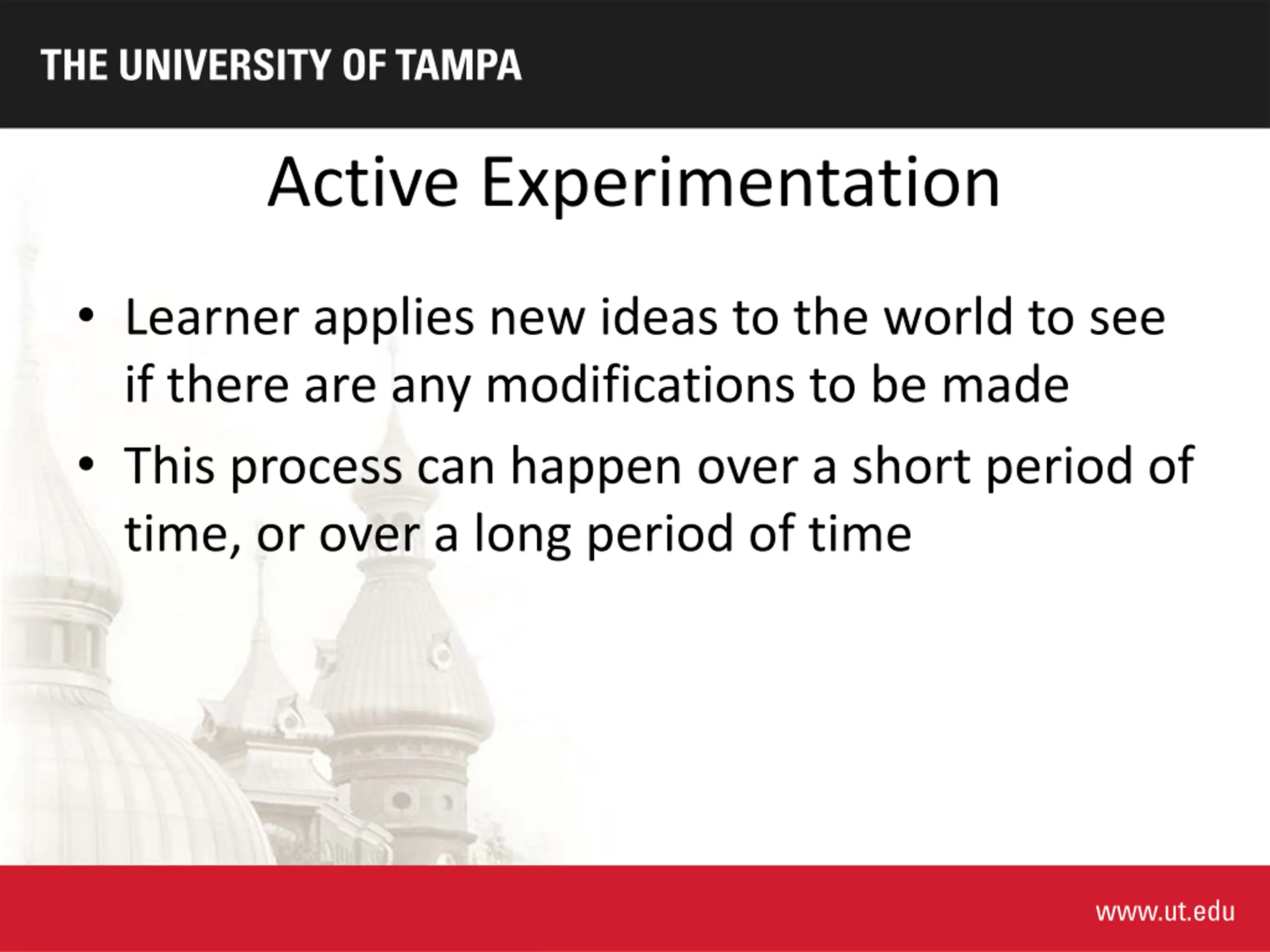 Active Experimentation Learner applies new ideas to the world to see if there are any modifications to be made This process can happen over a short period of time, or over a long period of time