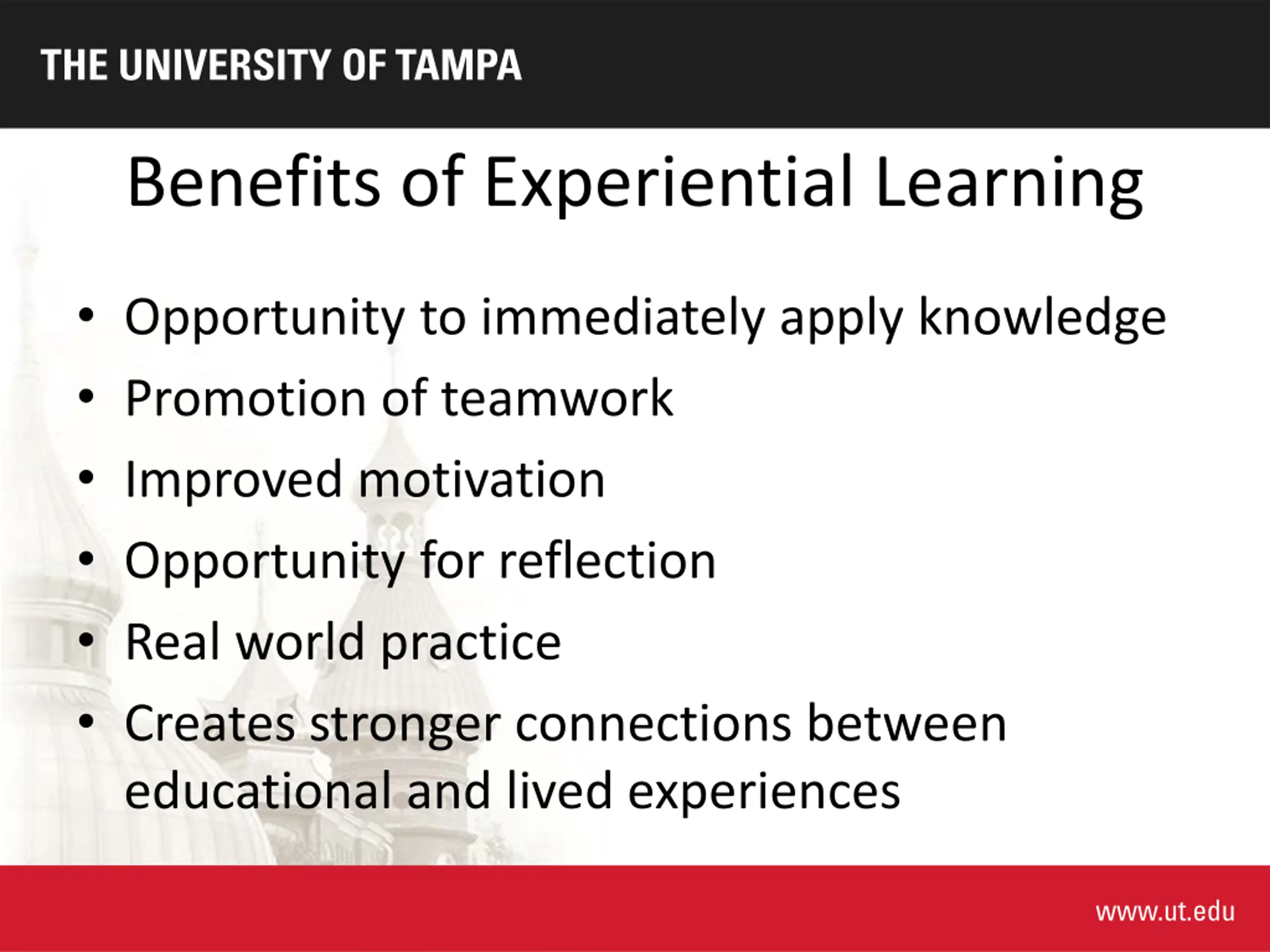 Benefits of Experiential Learning Opportunity to immediately apply knowledge Promotion of teamwork Improved motivation Opportunity for reflection Real world practice Creates stronger connections between educational and lived experiences
