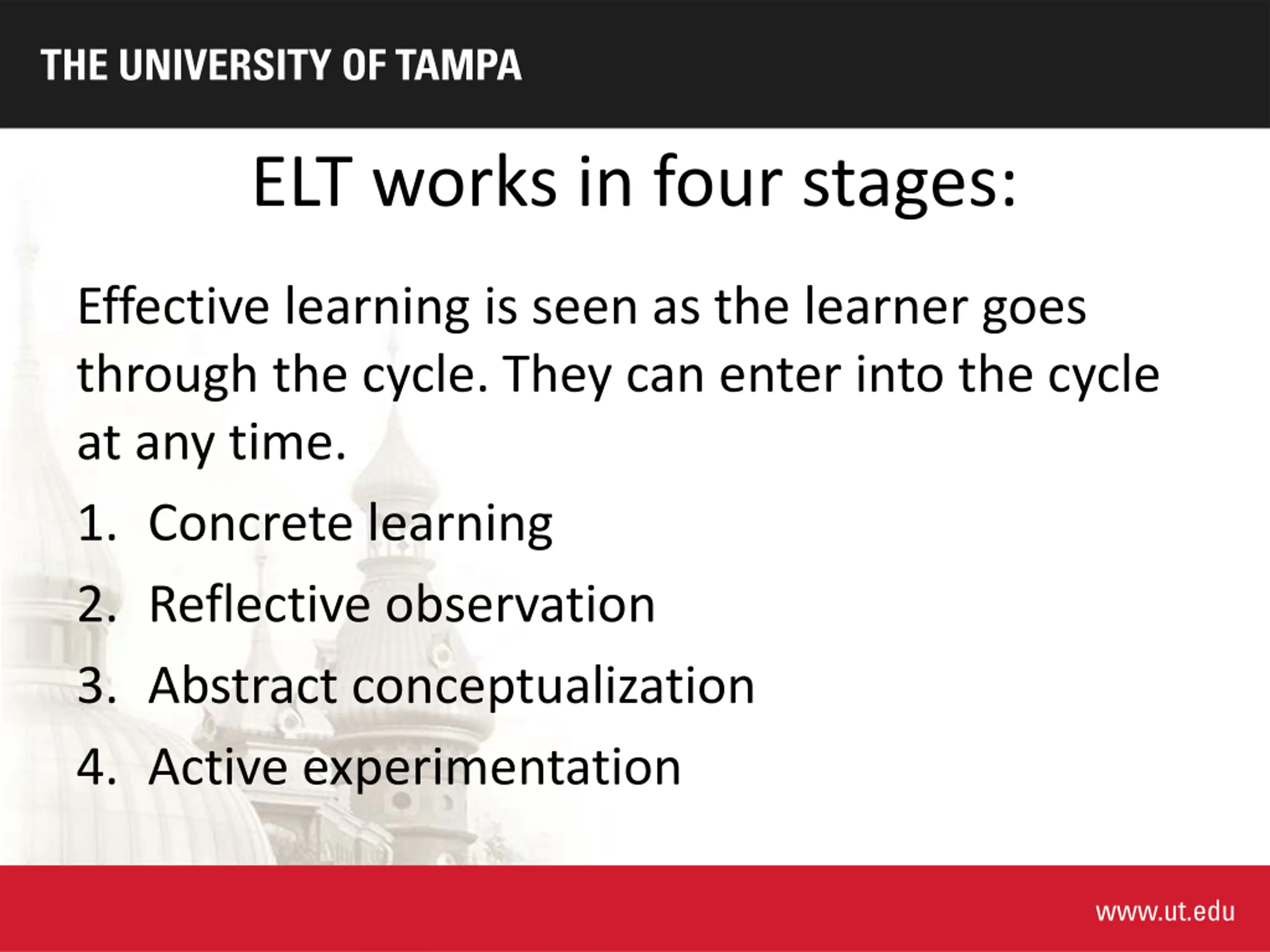 ELT works in four stages: Effective learning is seen as the learner goes through the cycle. They can enter into the cycle at any time. 1. Concrete learning 2. Reflective observation 3. Abstract conceptualization 4. Active experimentation