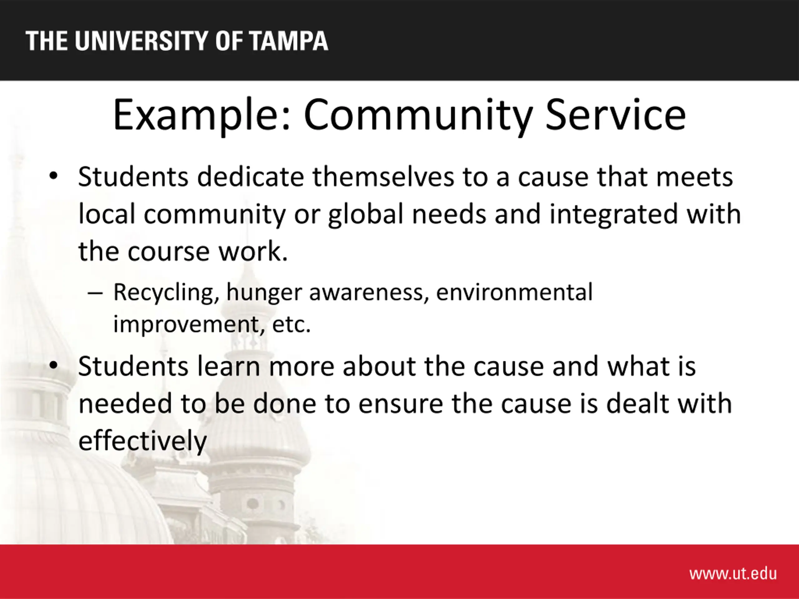 Example: Community Service Students dedicate themselves to a cause that meets local community or global needs and integrated with the course work. Recycling, hunger awareness, environmental improvement, etc. Students learn more about the cause and what is needed to be done to ensure the cause is dealt with effectively