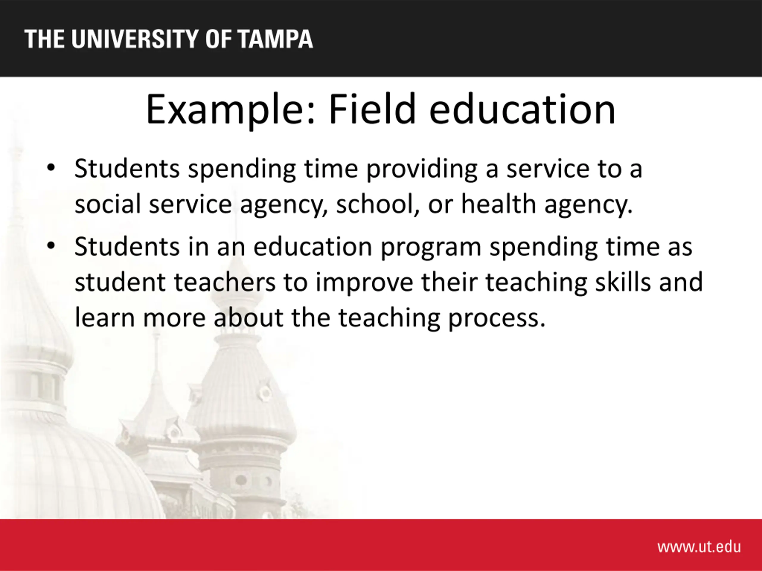Example: Field education Students spending time providing a service to a social service agency, school, or health agency. Students in an education program spending time as student teachers to improve their teaching skills and learn more about the teaching process.