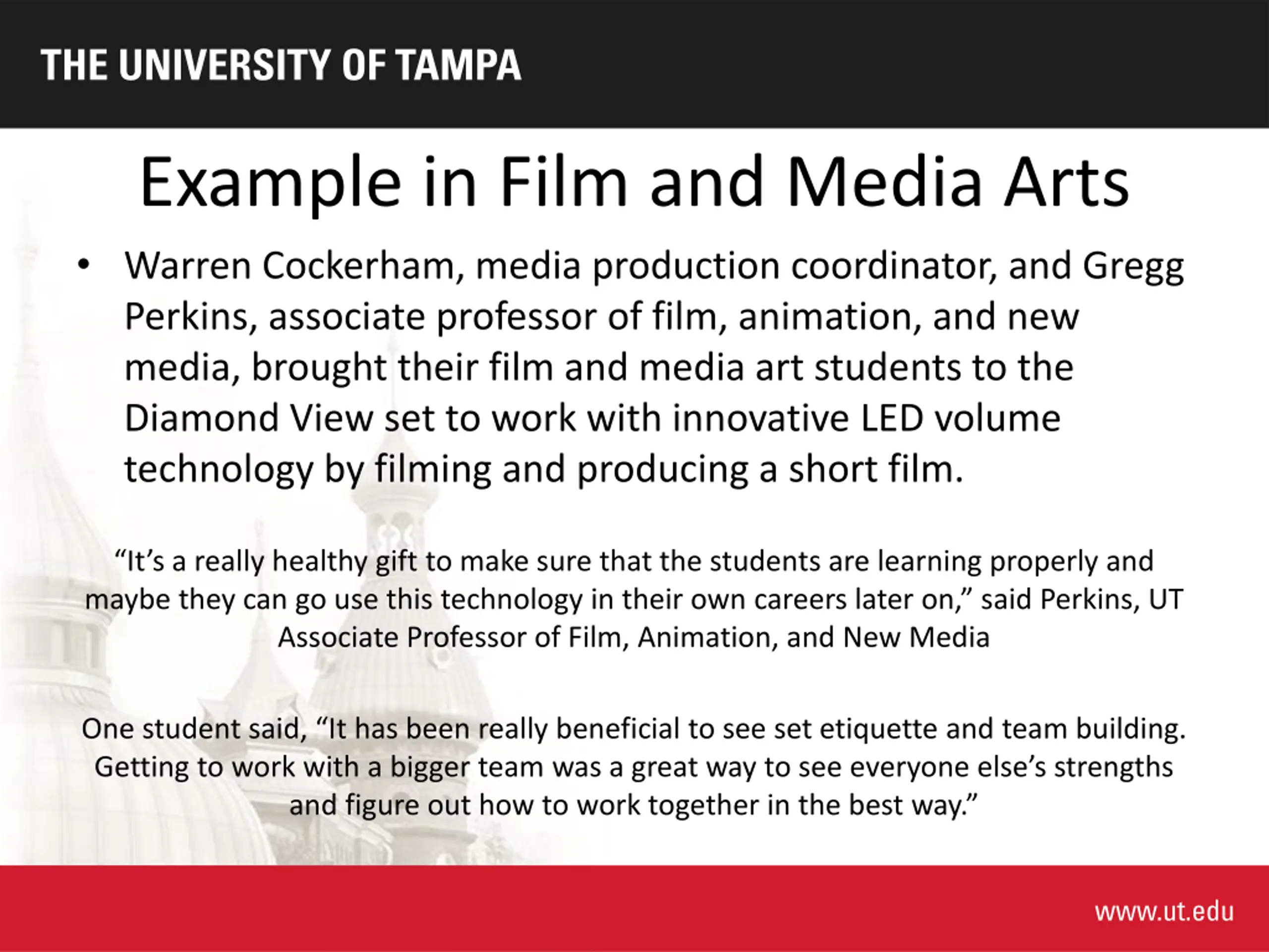 Example in Film and Media Arts Warren Cockerham, media production coordinator, and Gregg Perkins, associate professor of film, animation, and new media, brought their film and media art students to the Diamond View set to work with innovative LED volume technology by filming and producing a short film. It s a really healthy gift to make sure that the students are learning properly and maybe they can go use this technology in their own careers later on, said Perkins, UT Associate Professor of Film, Animation, and New Media One student said, It has been really beneficial to see set etiquette and team building. Getting to work with a bigger team was a great way to see everyone else s strengths and figure out how to work together in the best way.