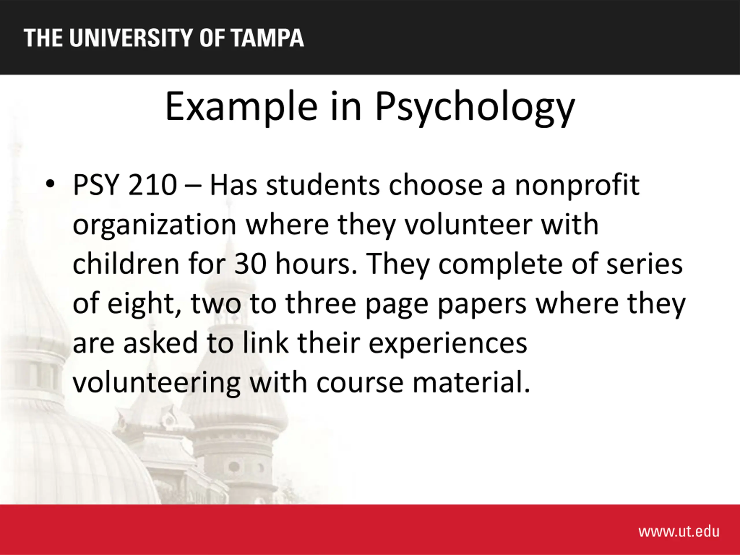 Example in Psychology PSY 210 Has students choose a nonprofit organization where they volunteer with children for 30 hours. They complete of series of eight, two to three page papers where they are asked to link their experiences volunteering with course material.