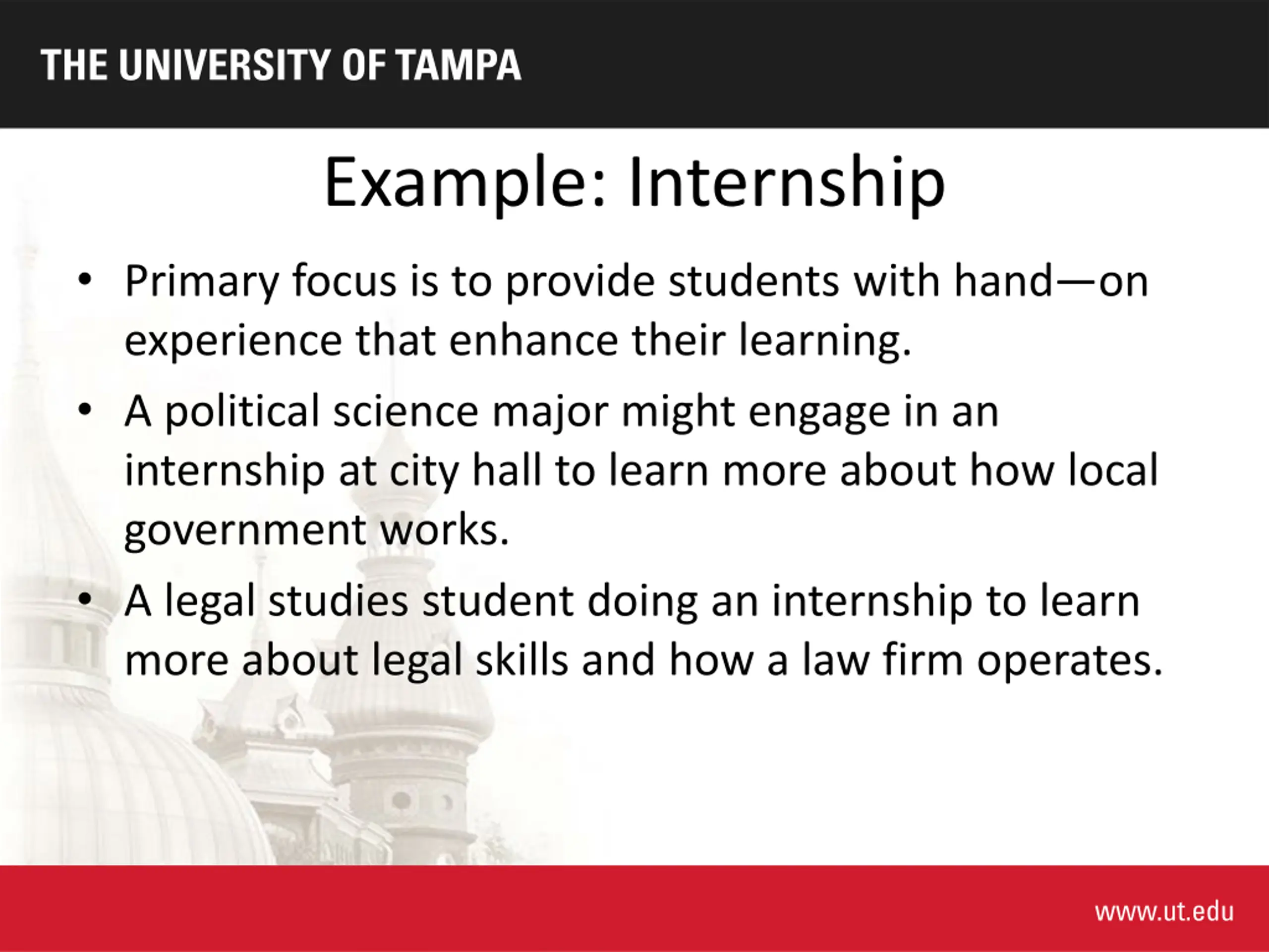 Example: Internship Primary focus is to provide students with hand on experience that enhance their learning. A political science major might engage in an internship at city hall to learn more about how local government works. A legal studies student doing an internship to learn more about legal skills and how a law firm operates.