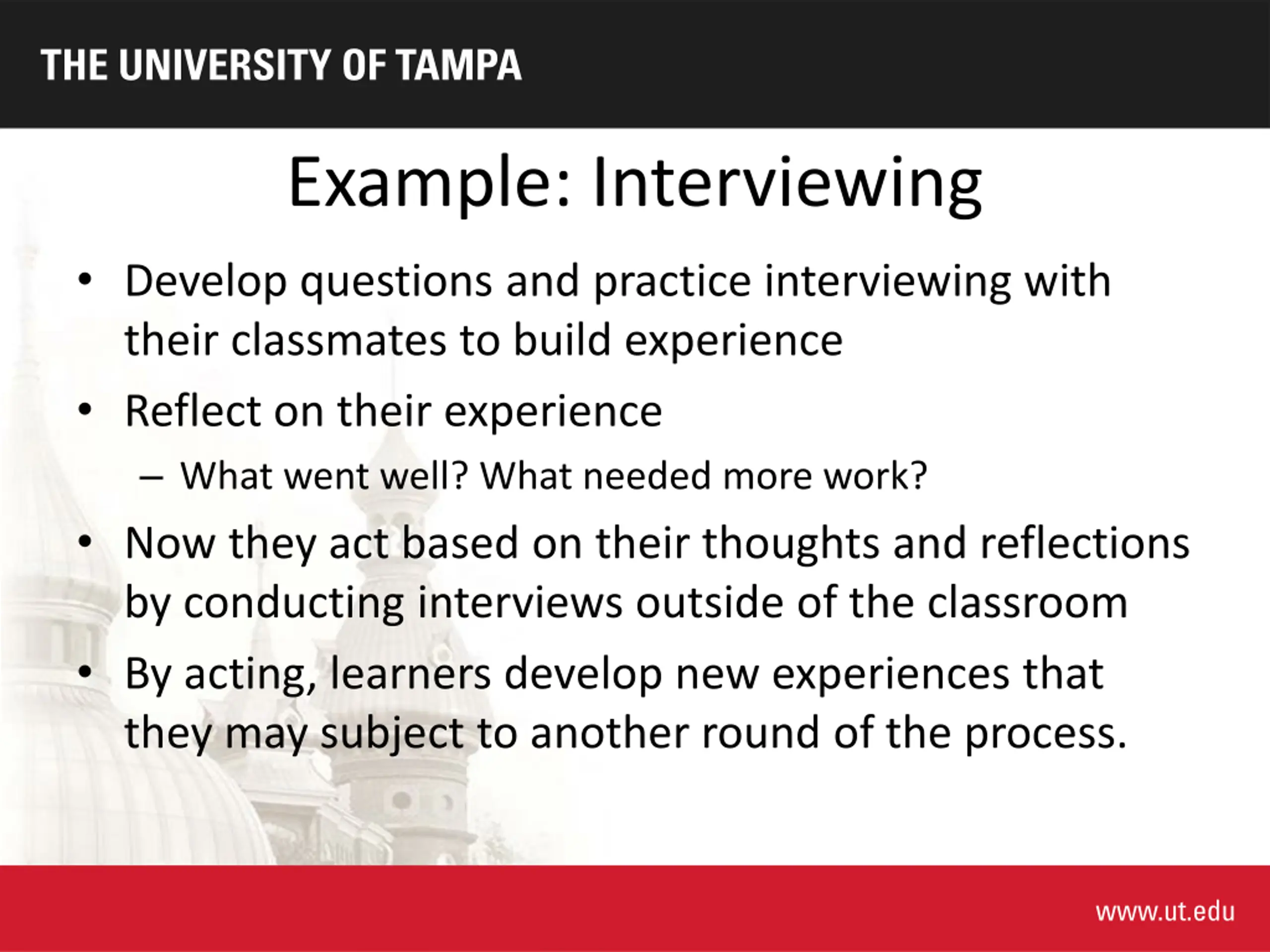 Example: Interviewing Develop questions and practice interviewing with their classmates to build experience Reflect on their experience What went well? What needed more work? Now they act based on their thoughts and reflections by conducting interviews outside of the classroom By acting, learners develop new experiences that they may subject to another round of the process.