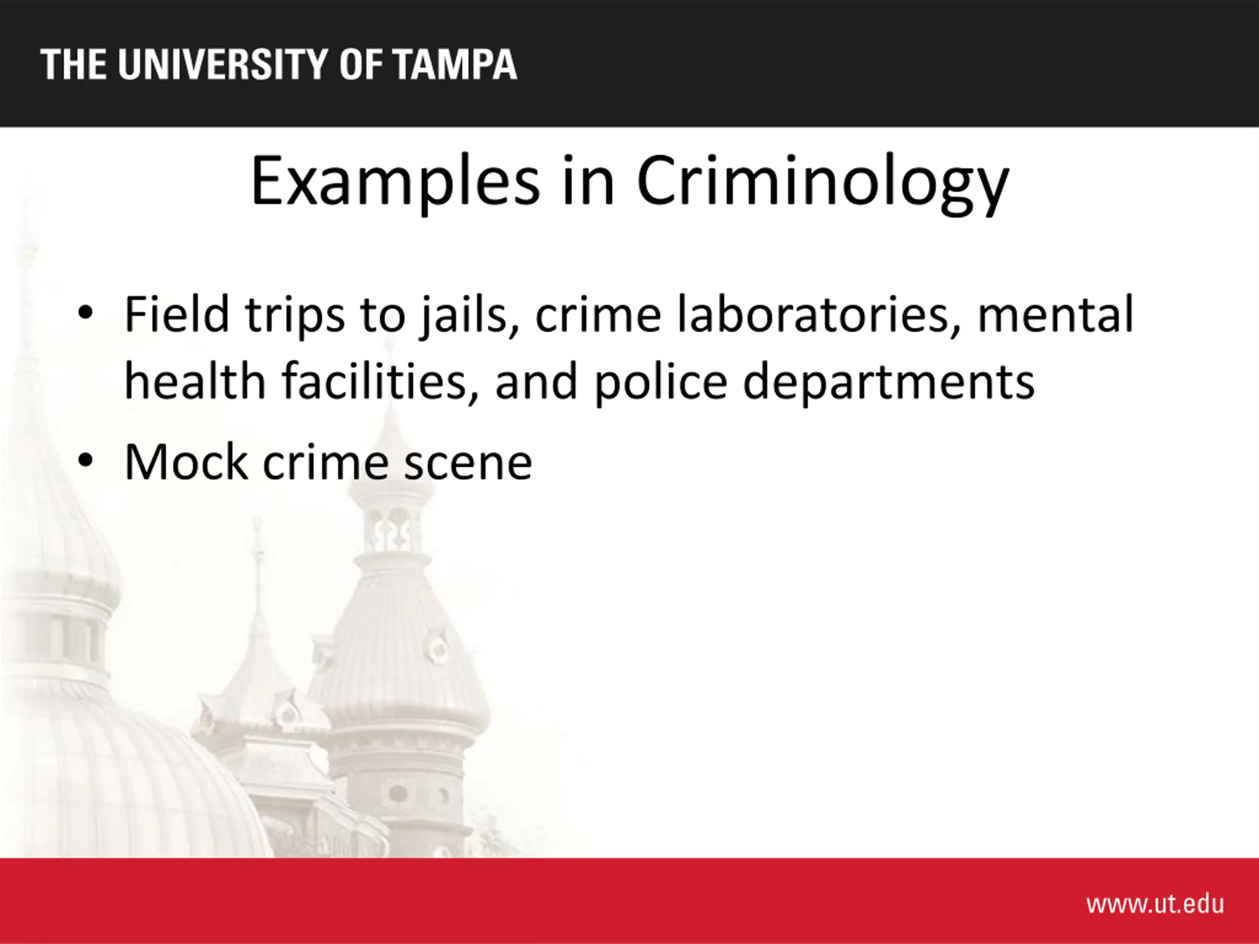 Examples in Criminology Field trips to jails, crime laboratories, mental health facilities, and police departments Mock crime scene